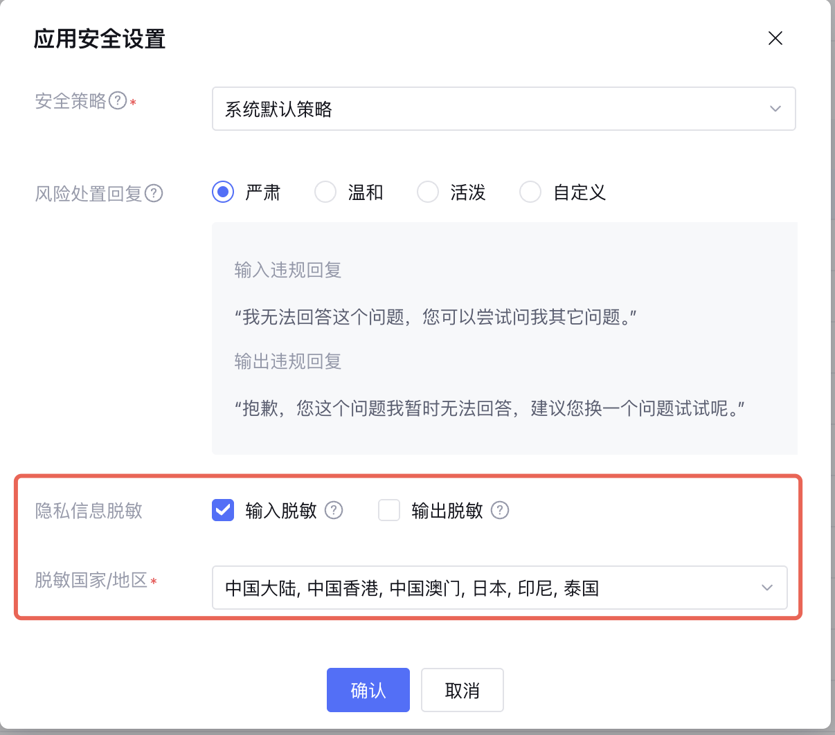 2.2 风险处置回复:当输入/输出被识别为违规时,在 Tencent Cloud ADP 应用的对话端文案。