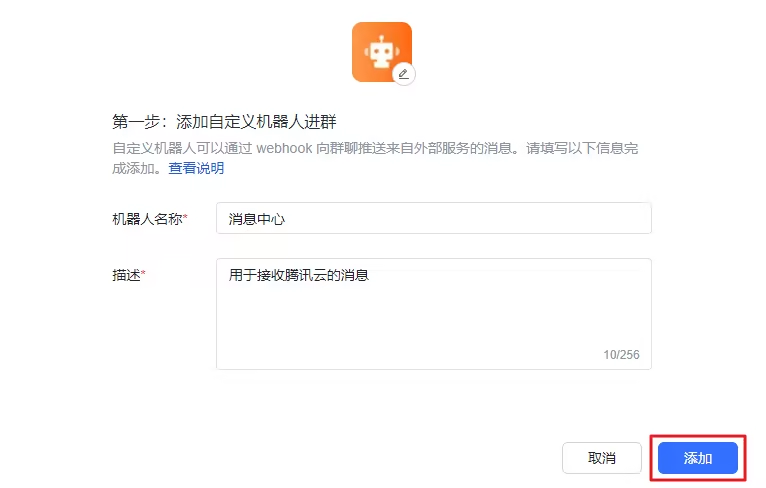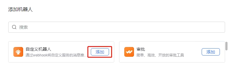 在添加机器人页面,单击自定义机器人里的