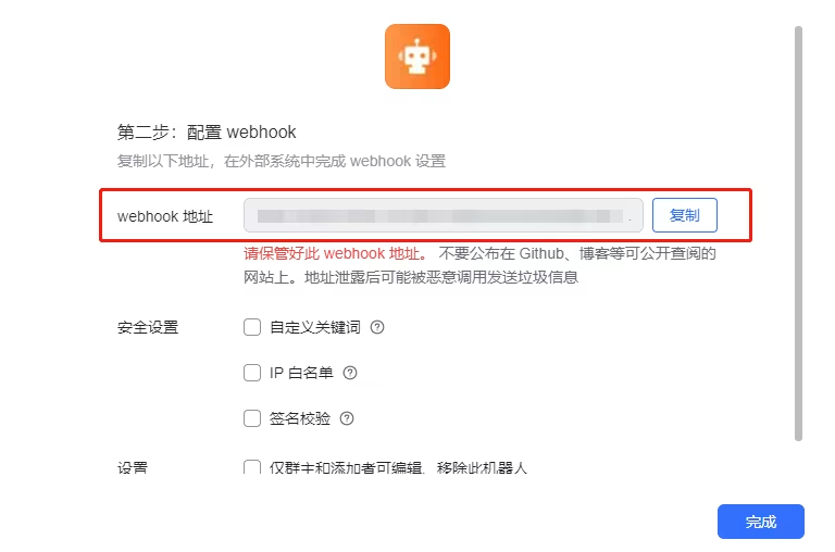 添加完成后,界面会展示 Webhook 地址。