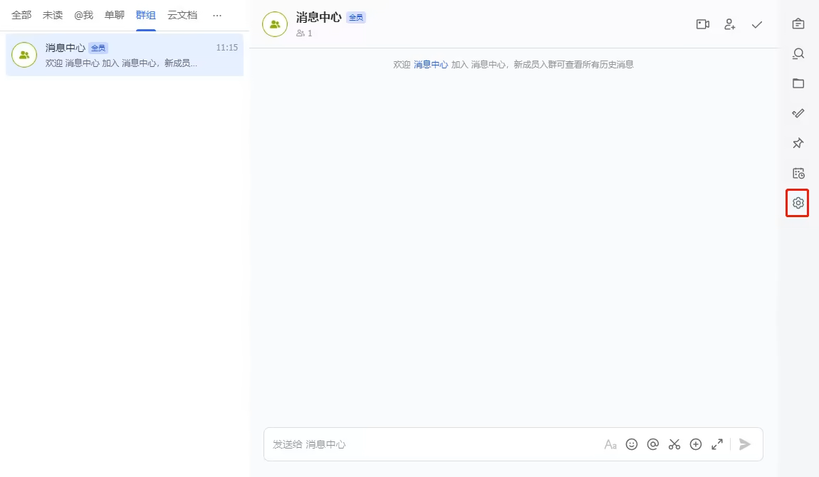 打开飞书 PC 端,找到需要接收消息的飞书群,单击设置图标。