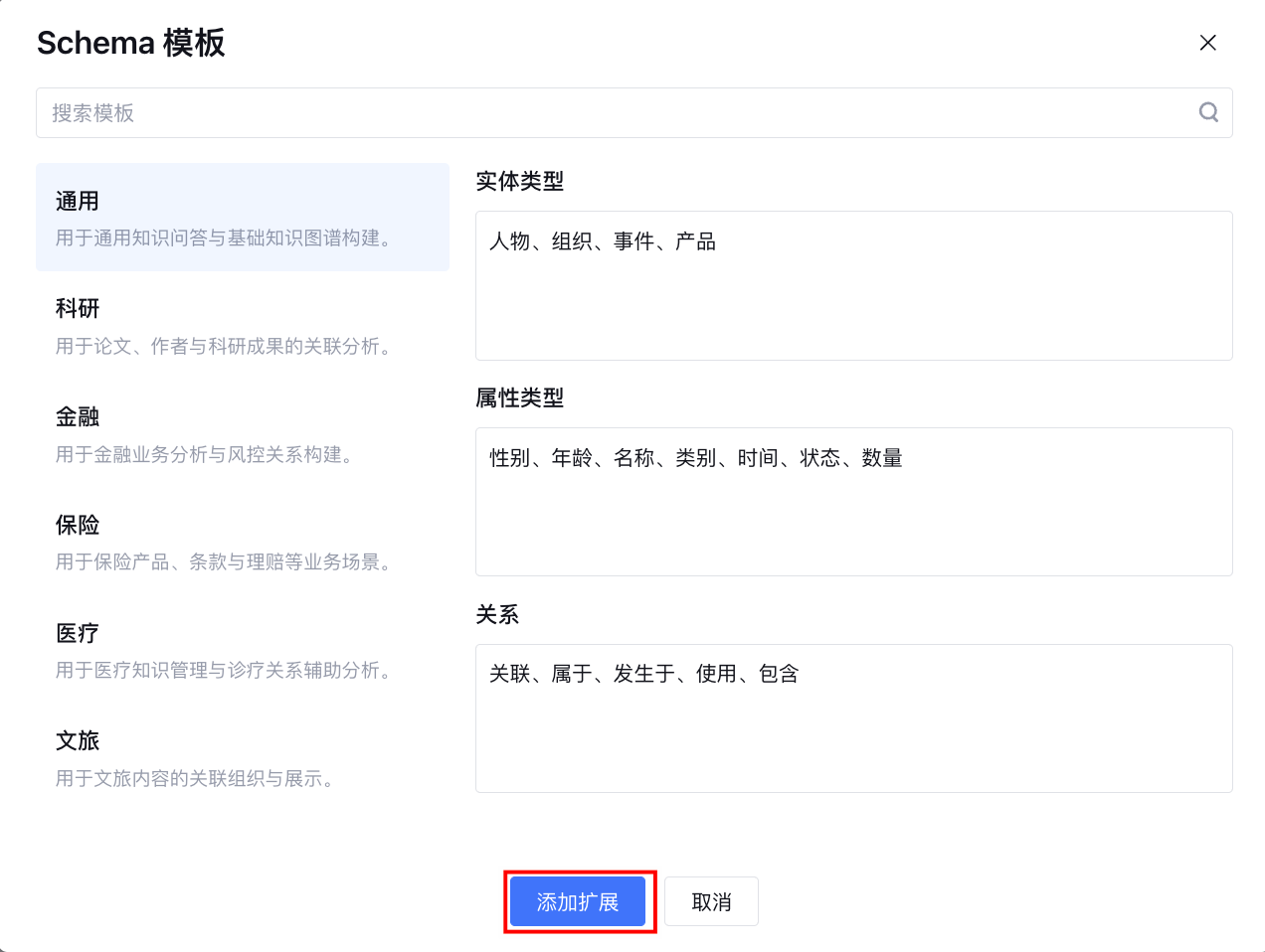 单击添加扩展,选择的 Schema 模板内容将自动回填 Graph Schema 表格中。