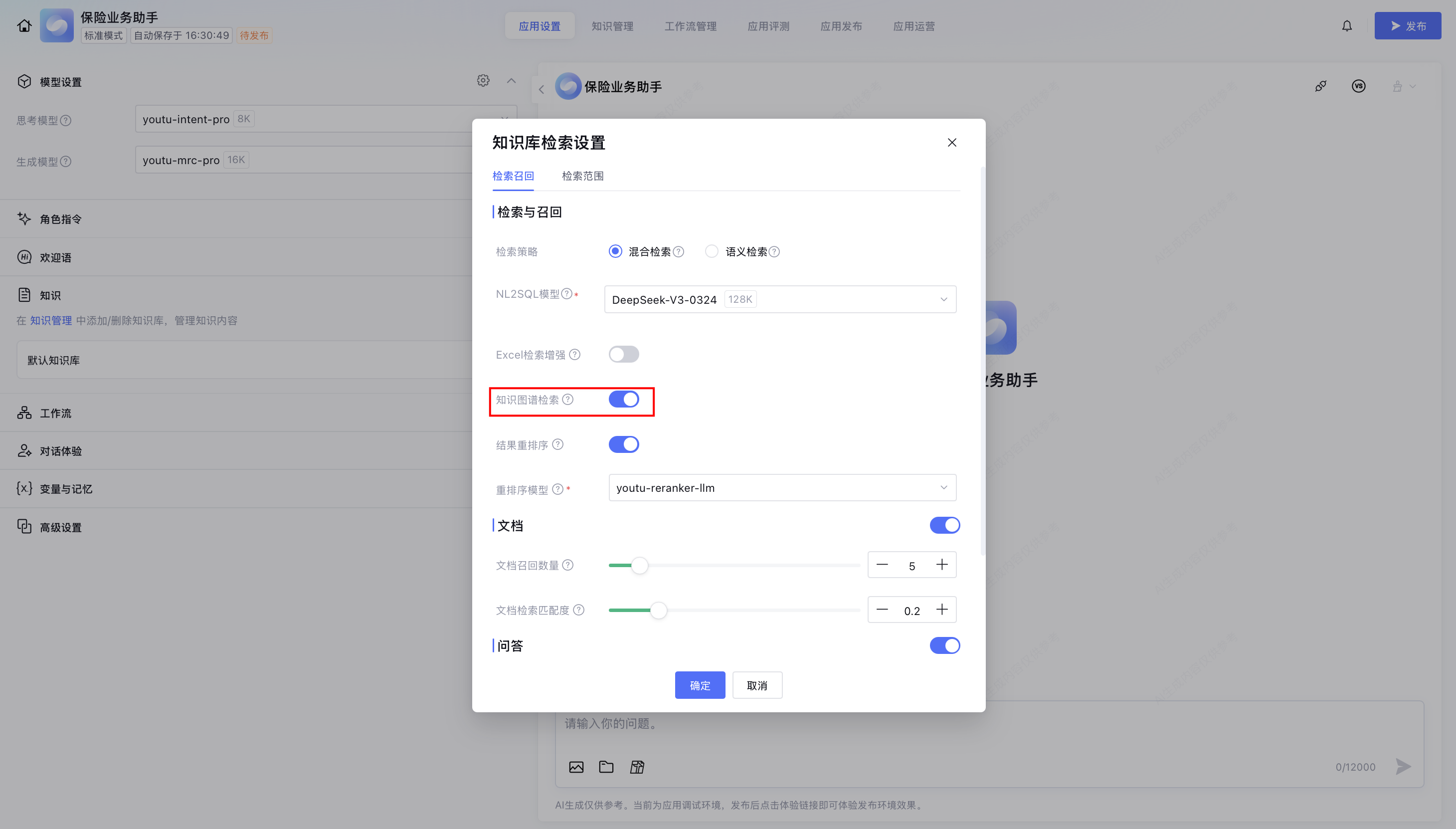 在知识管理页面上传所需文档并生成知识图谱后,回到应用设置页面,在知识库检索设置中,打开知识图谱检索开关。