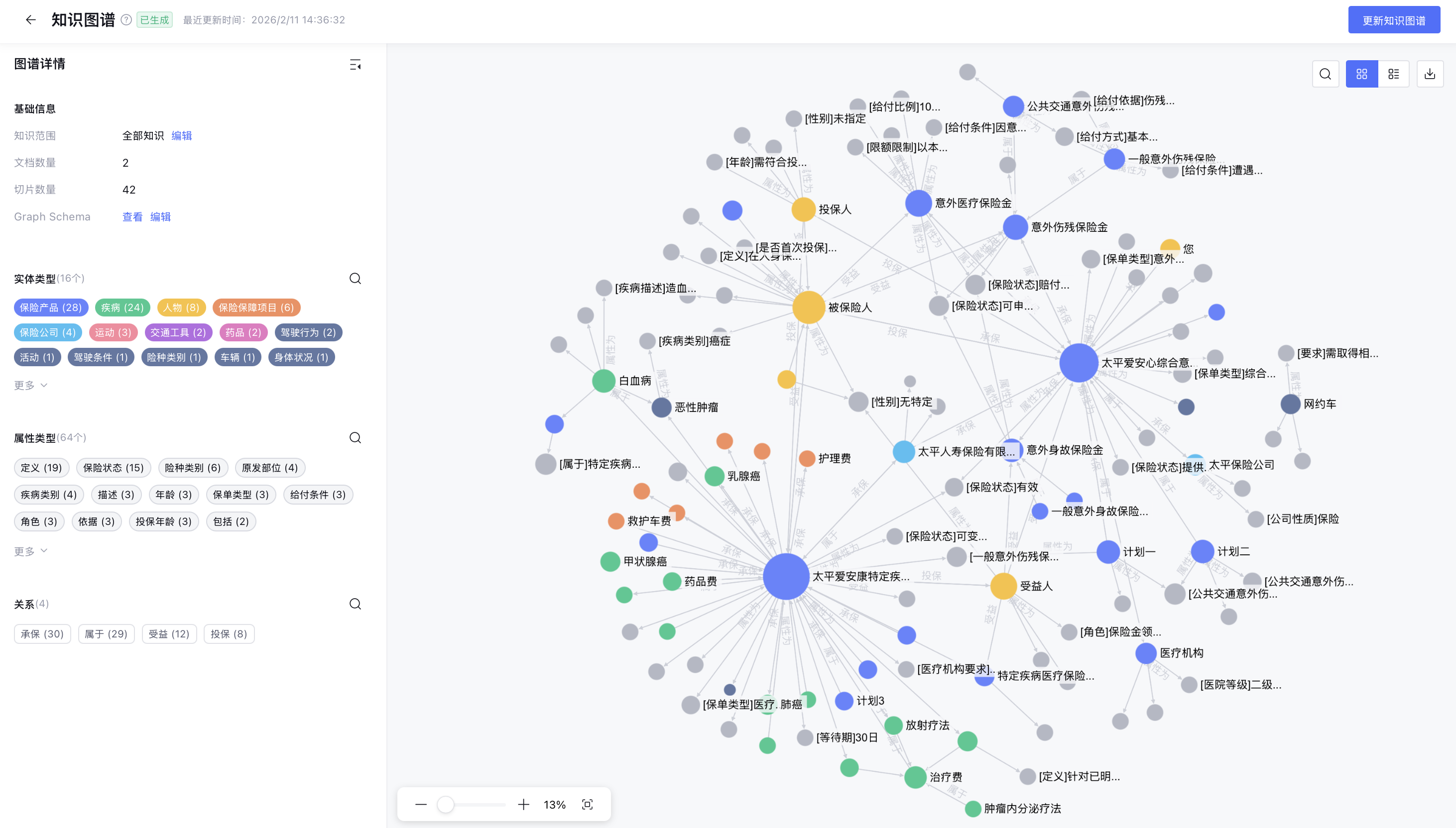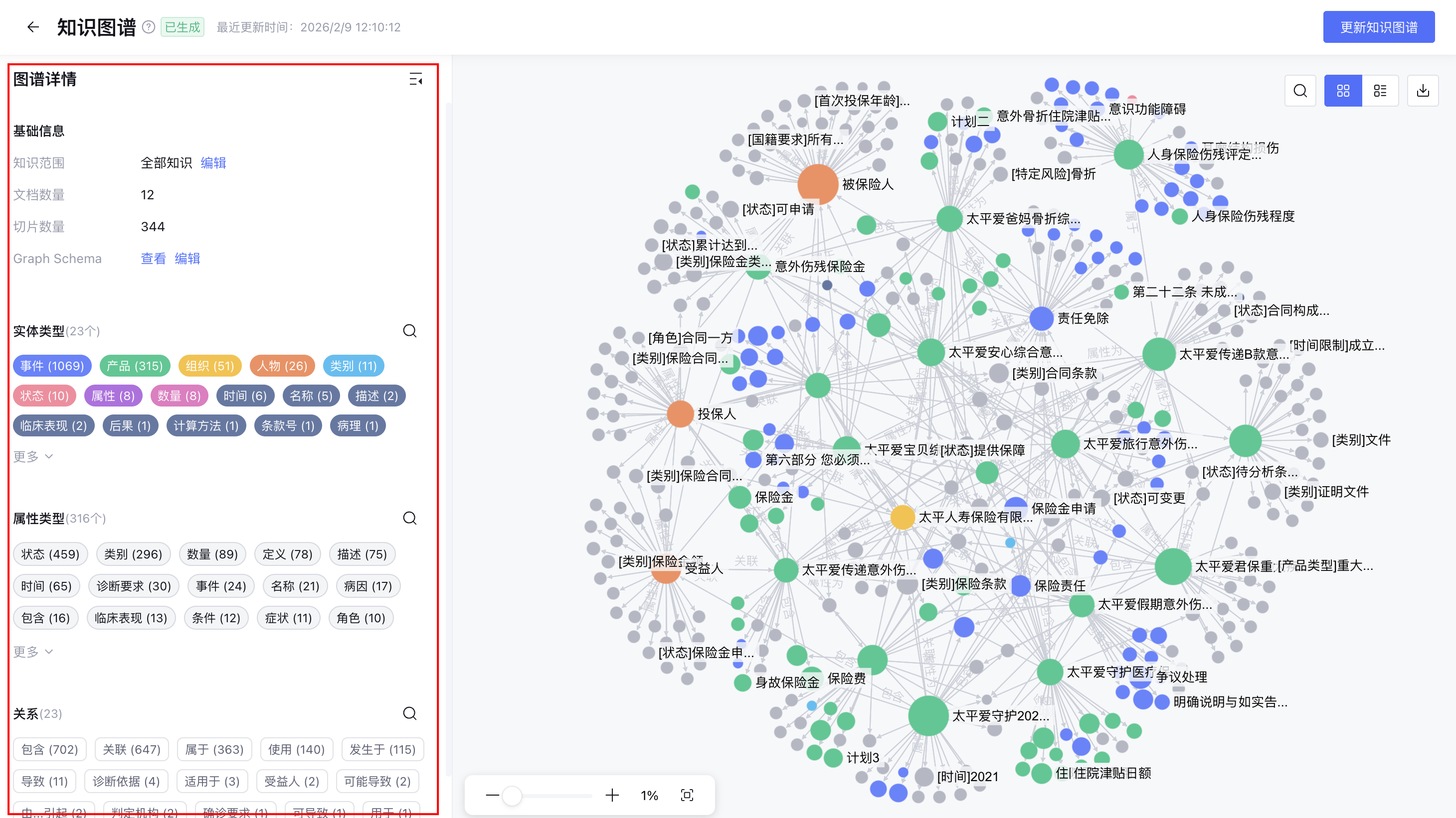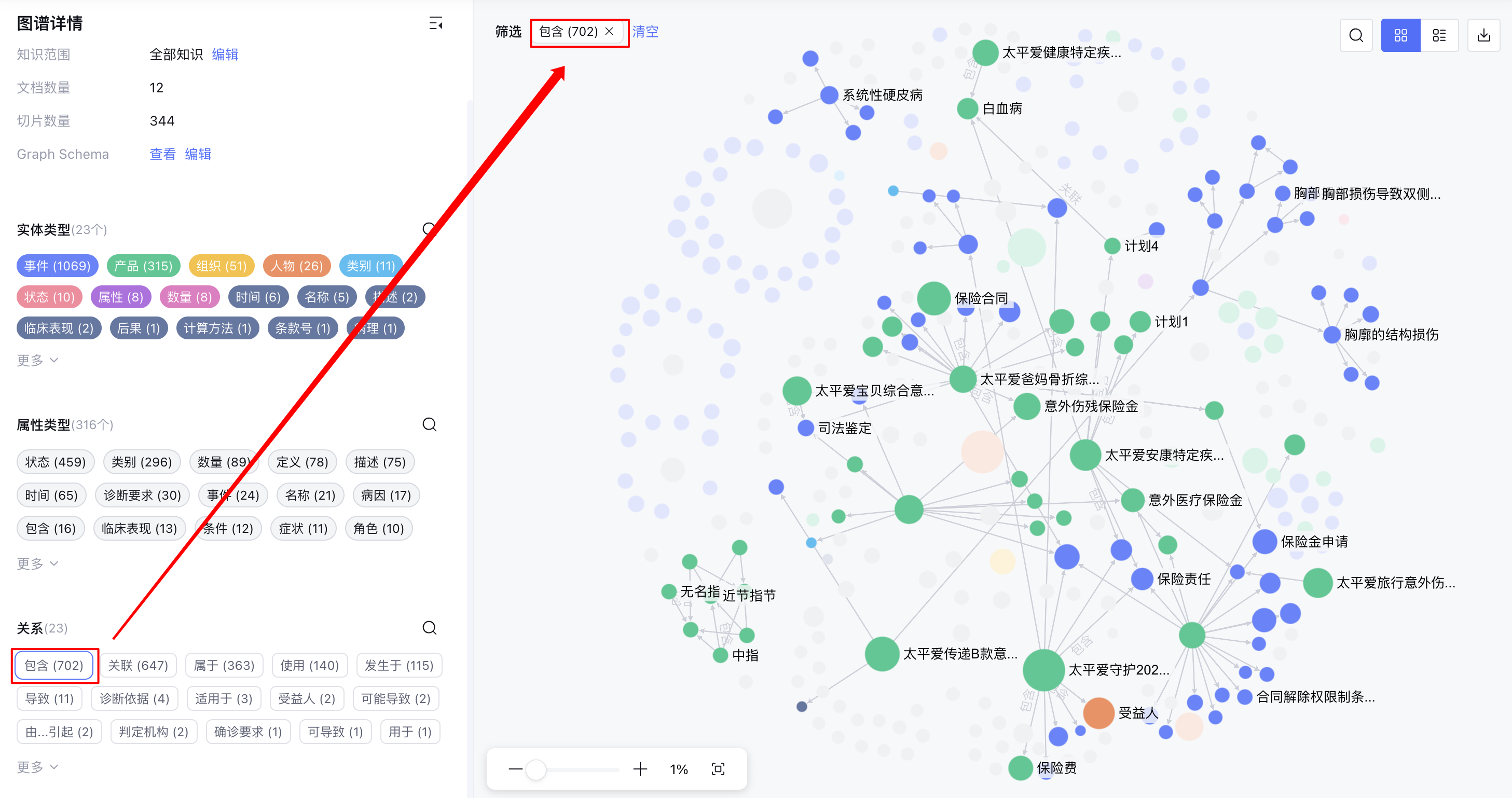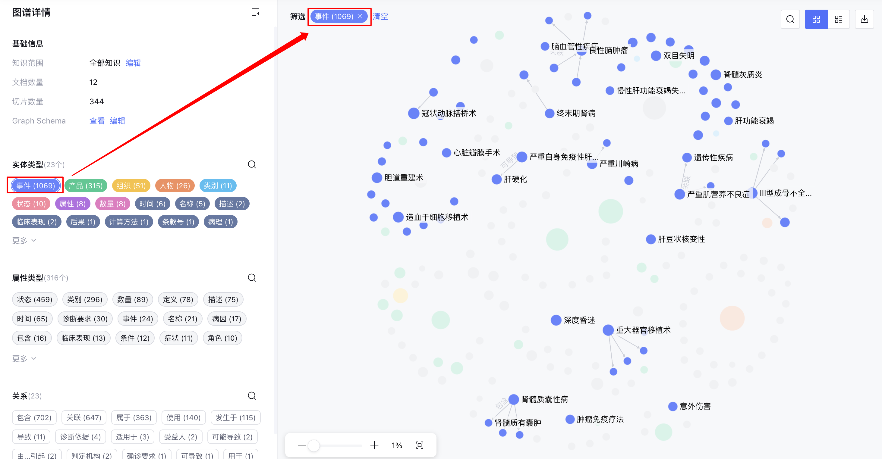 图谱构建完成后,您可以在左侧边栏的图谱详情中查看图谱的整体统计信息,并通过点击实体、属性或关系,快速对知识图谱进行筛选。