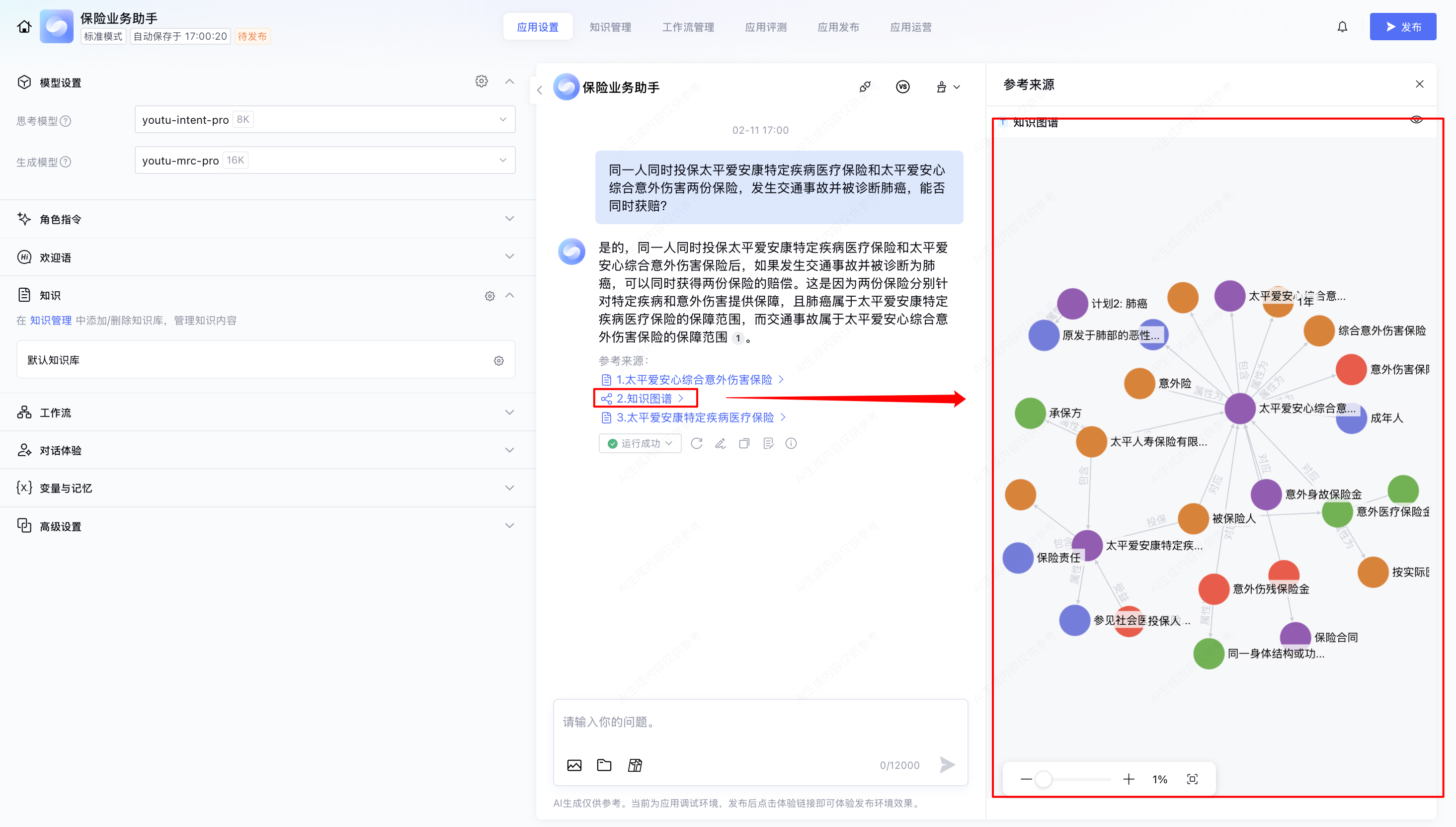 以标准模式应用保险业务助手为例展示知识图谱检索问答。