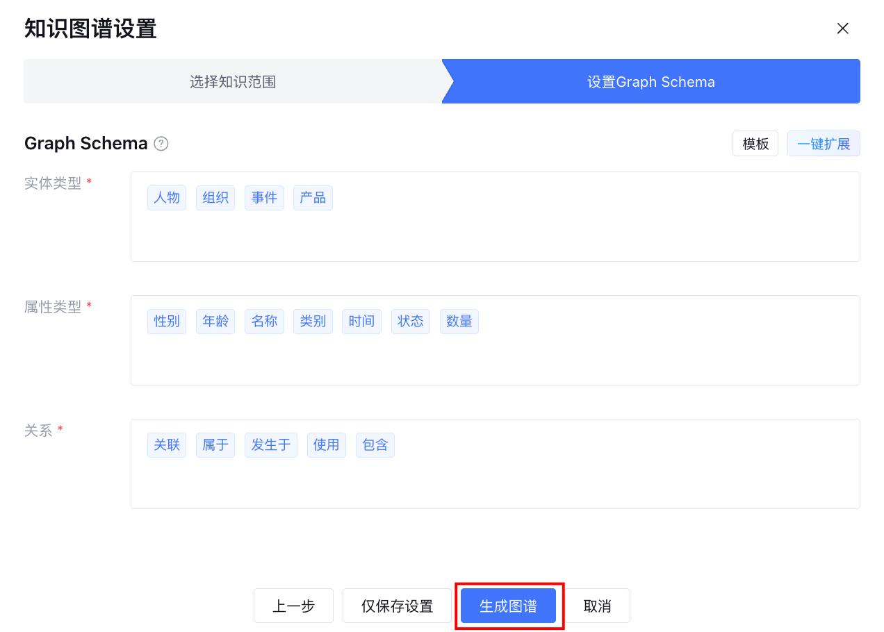 基于已填写的 Graph Schema,单击一键扩展,大模型将结合填写内容与知识库文档信息,自动推理并进行内容扩展。
