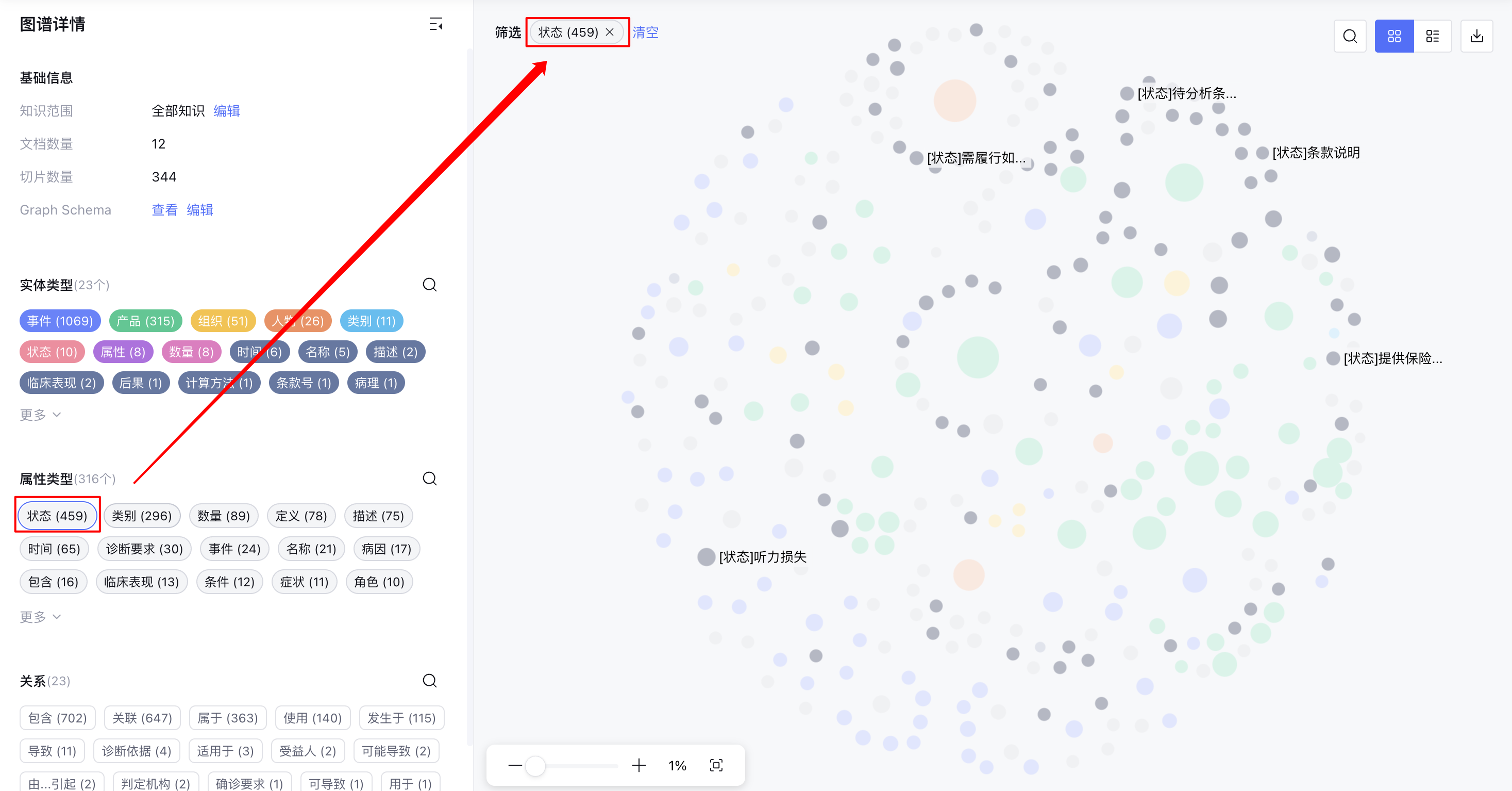 属性类型:展示属性总数及类型分布,点击某一属性类型后,将高亮展示对应类型的实体节点。