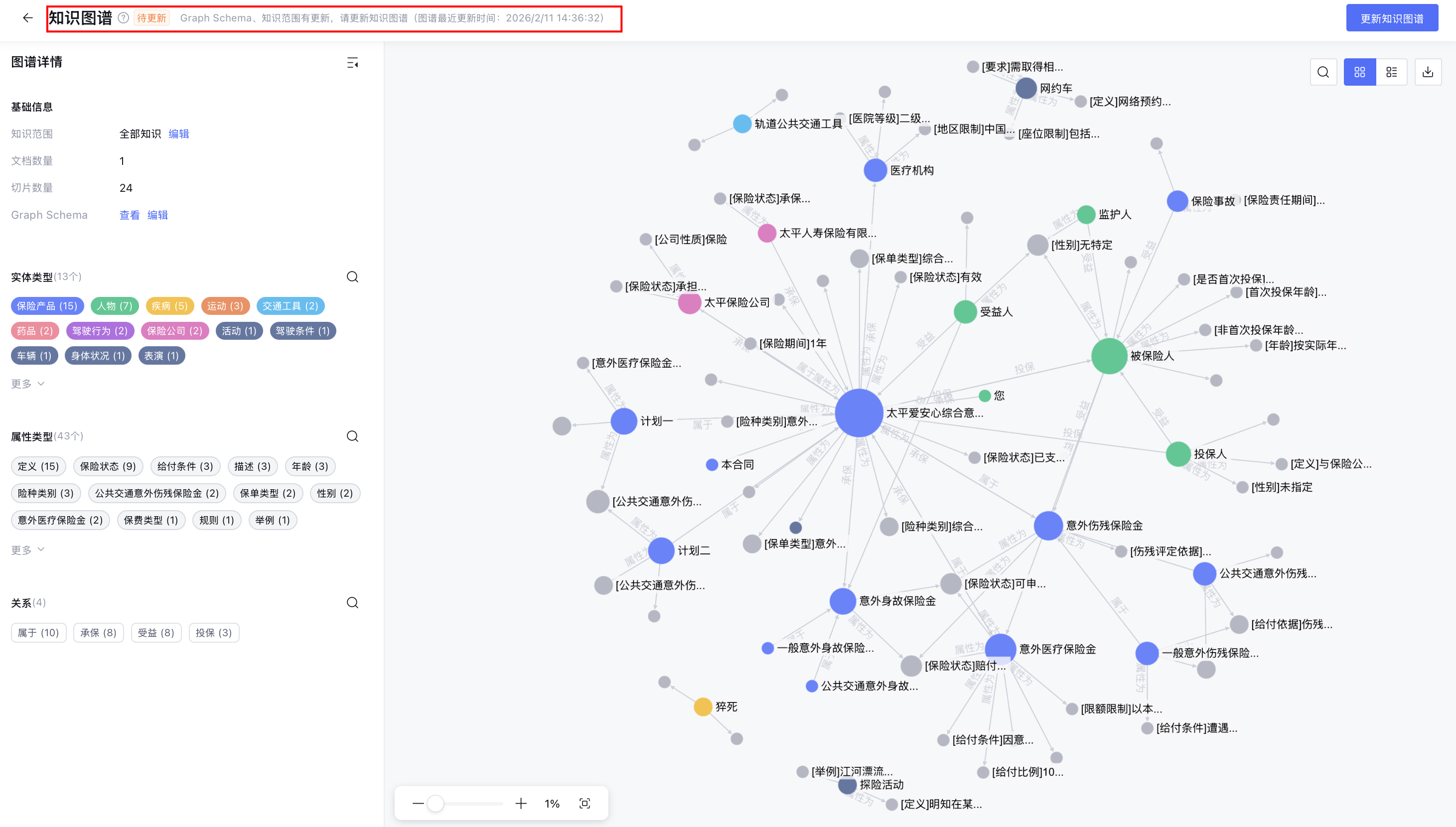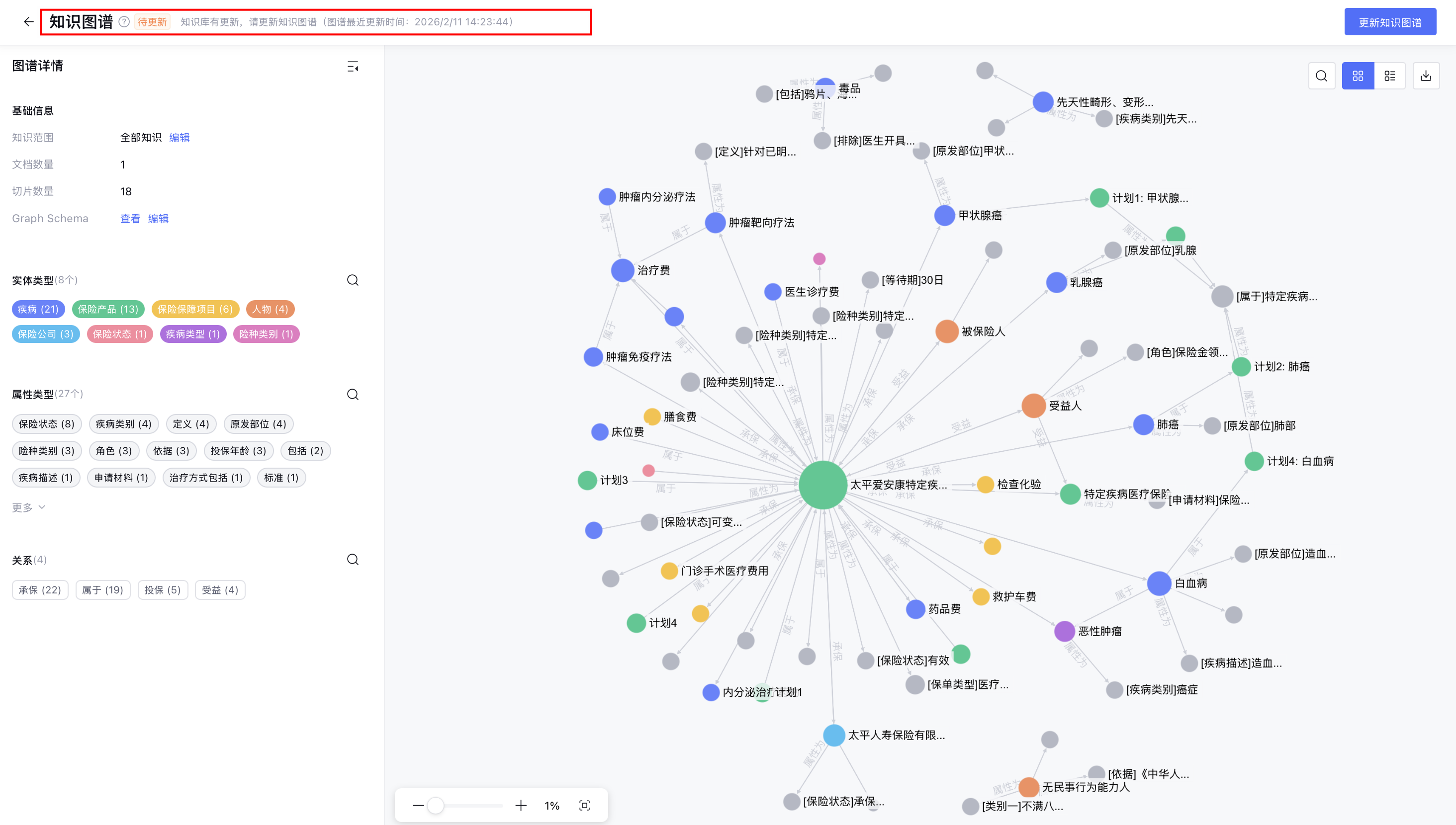 在知识图谱页面,顶部状态栏出现提示:知识库有更新,请更新知识图谱。
