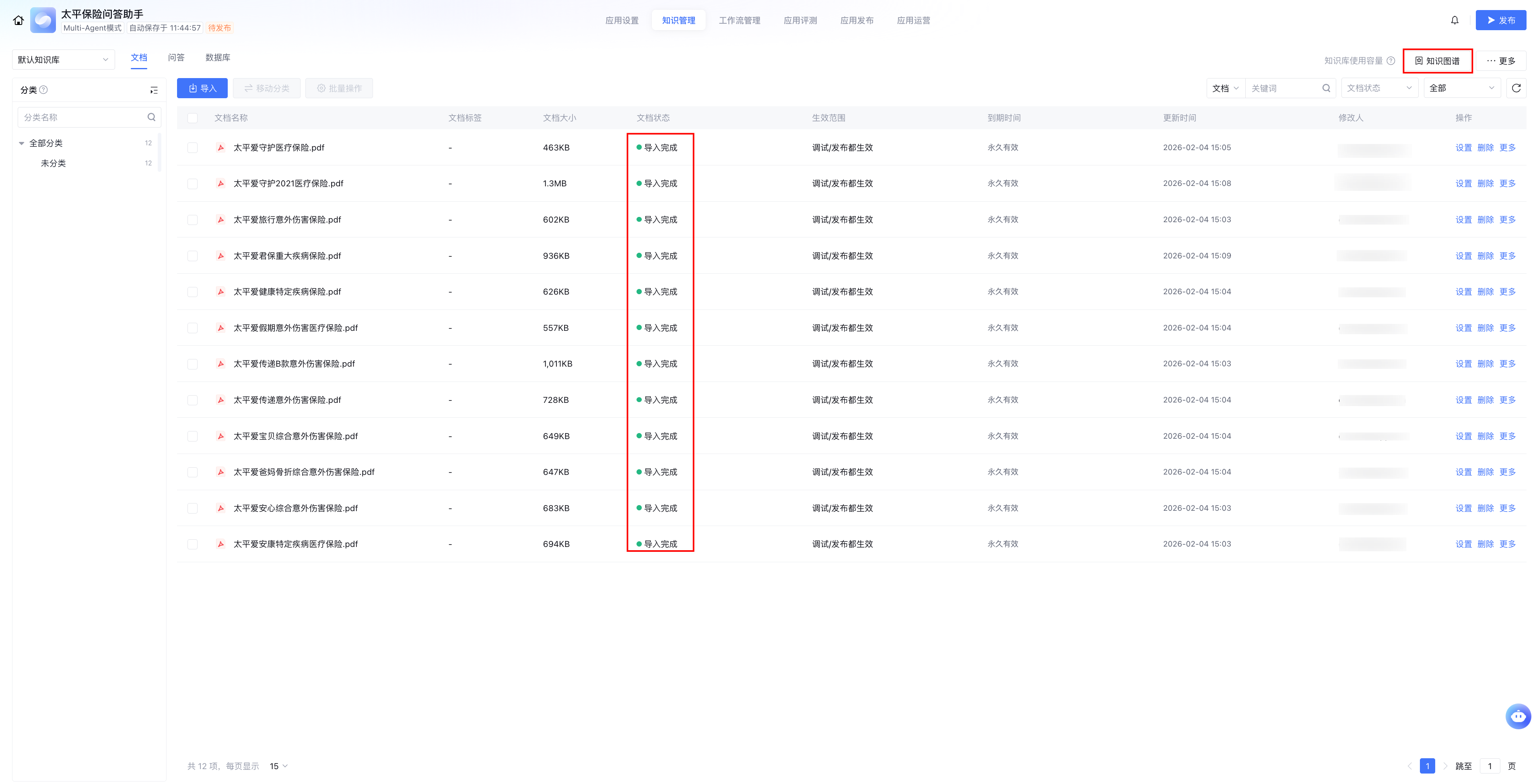 等待文档状态显示为导入完成后,单击知识图谱,进入知识图谱界面。