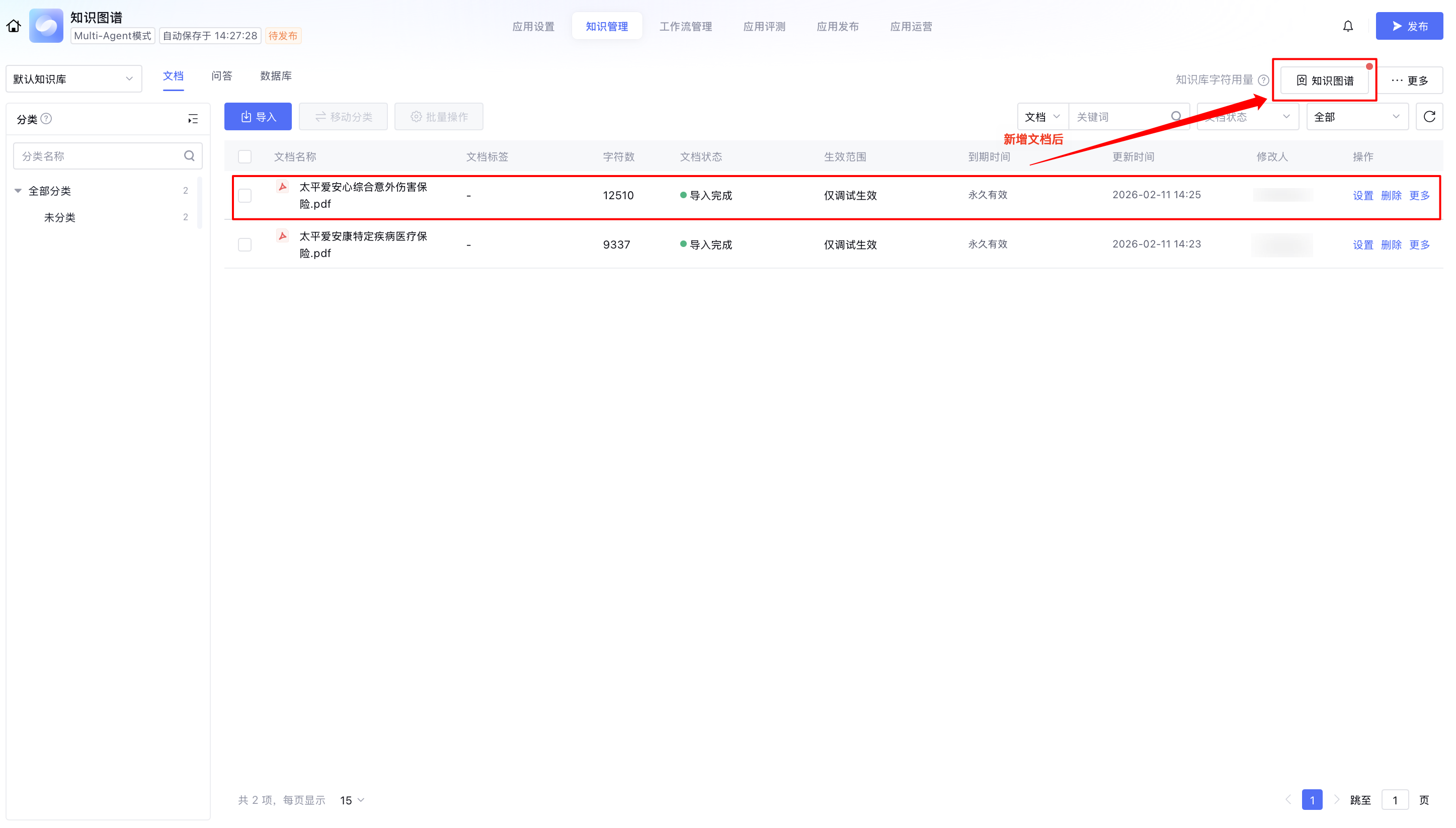 当知识库有新增文档时,知识管理页面的知识图谱入口显示红点提醒。