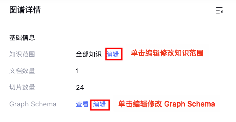 在图谱详情的基本信息,支持单击编辑对知识范围和 Graph Schema 进行修改。