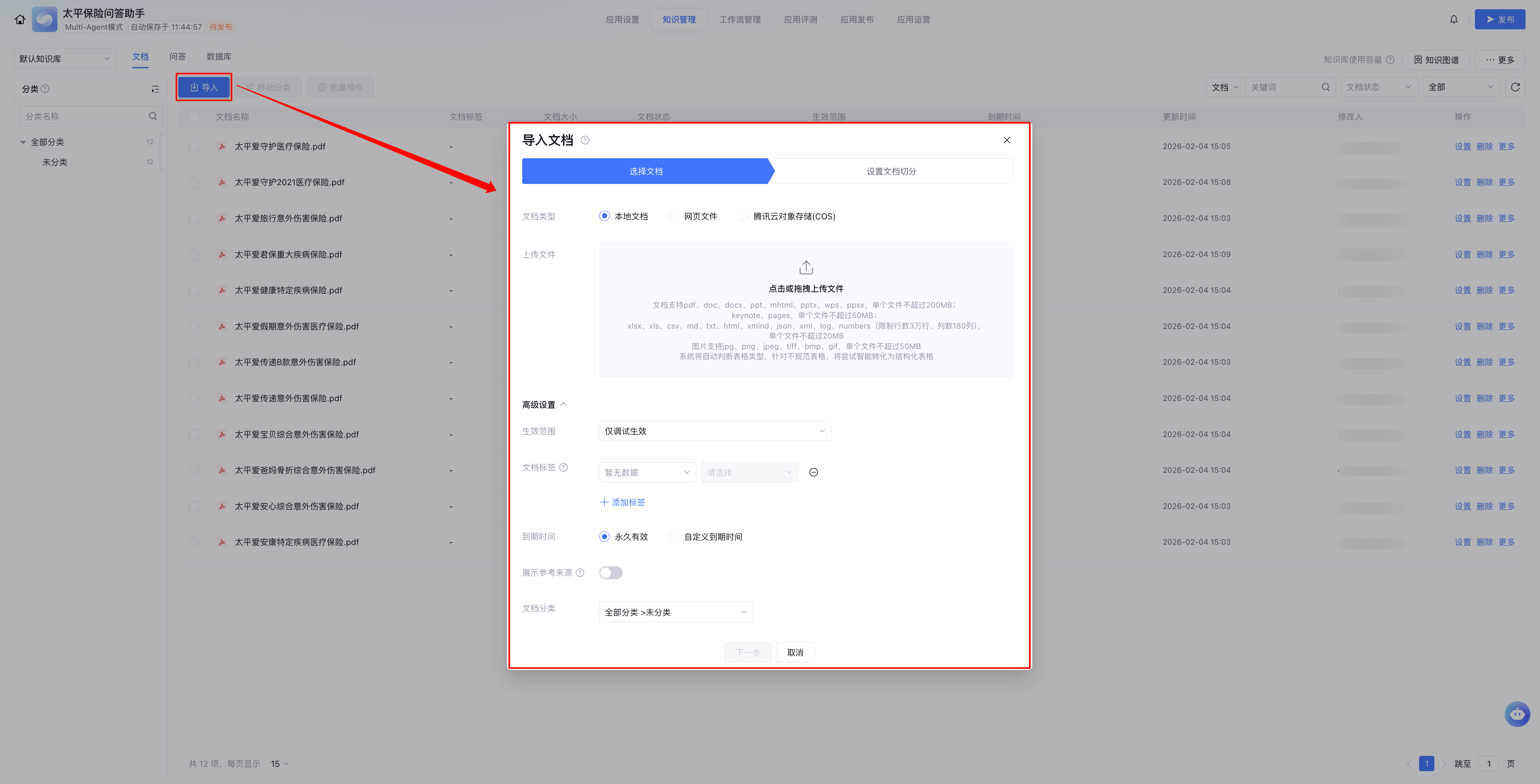 进入知识管理页面,单击导入,上传所需文档。