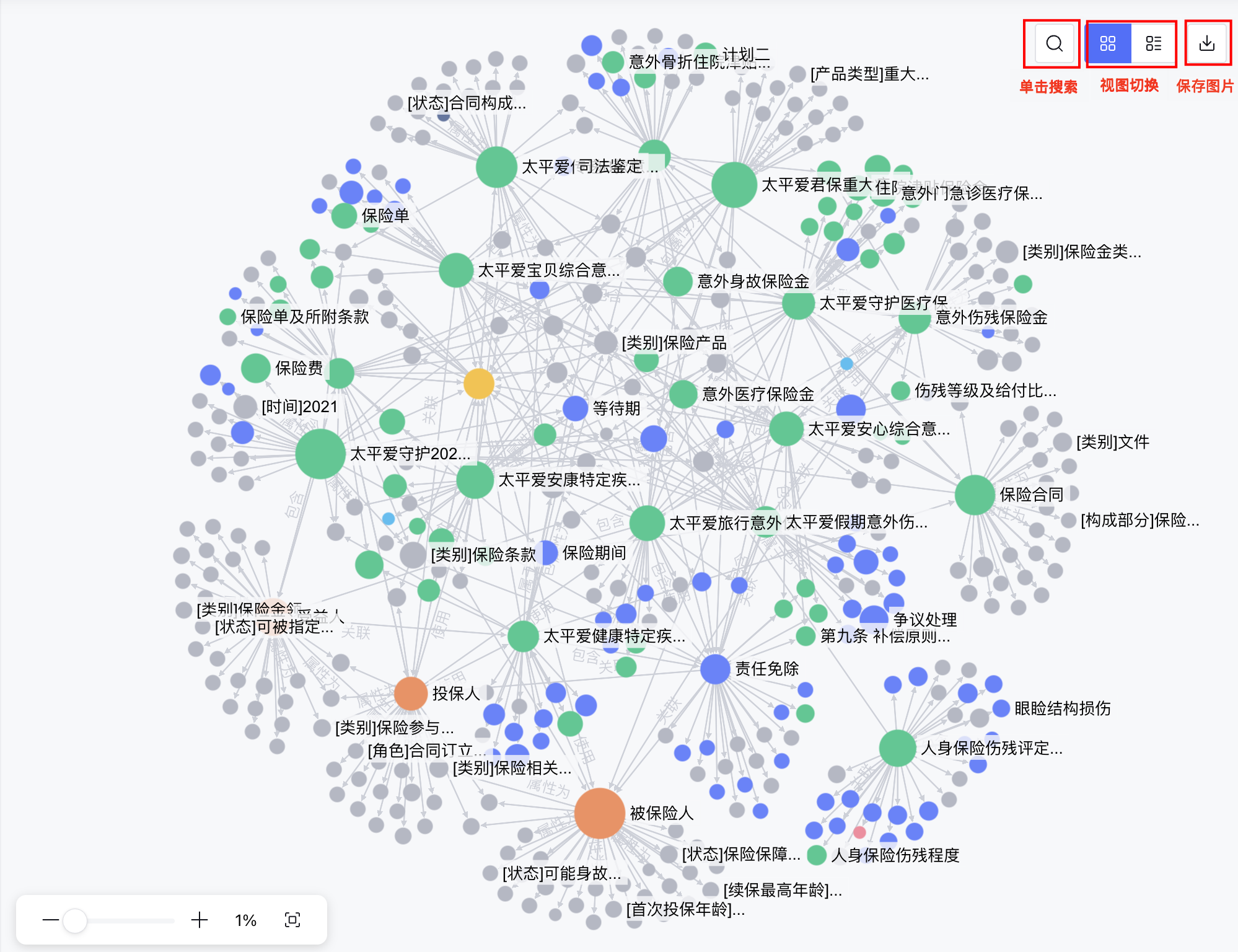 实体类型:展示实体总数及类型分布,点击某一实体类型后,将高亮展示对应类型的实体节点。