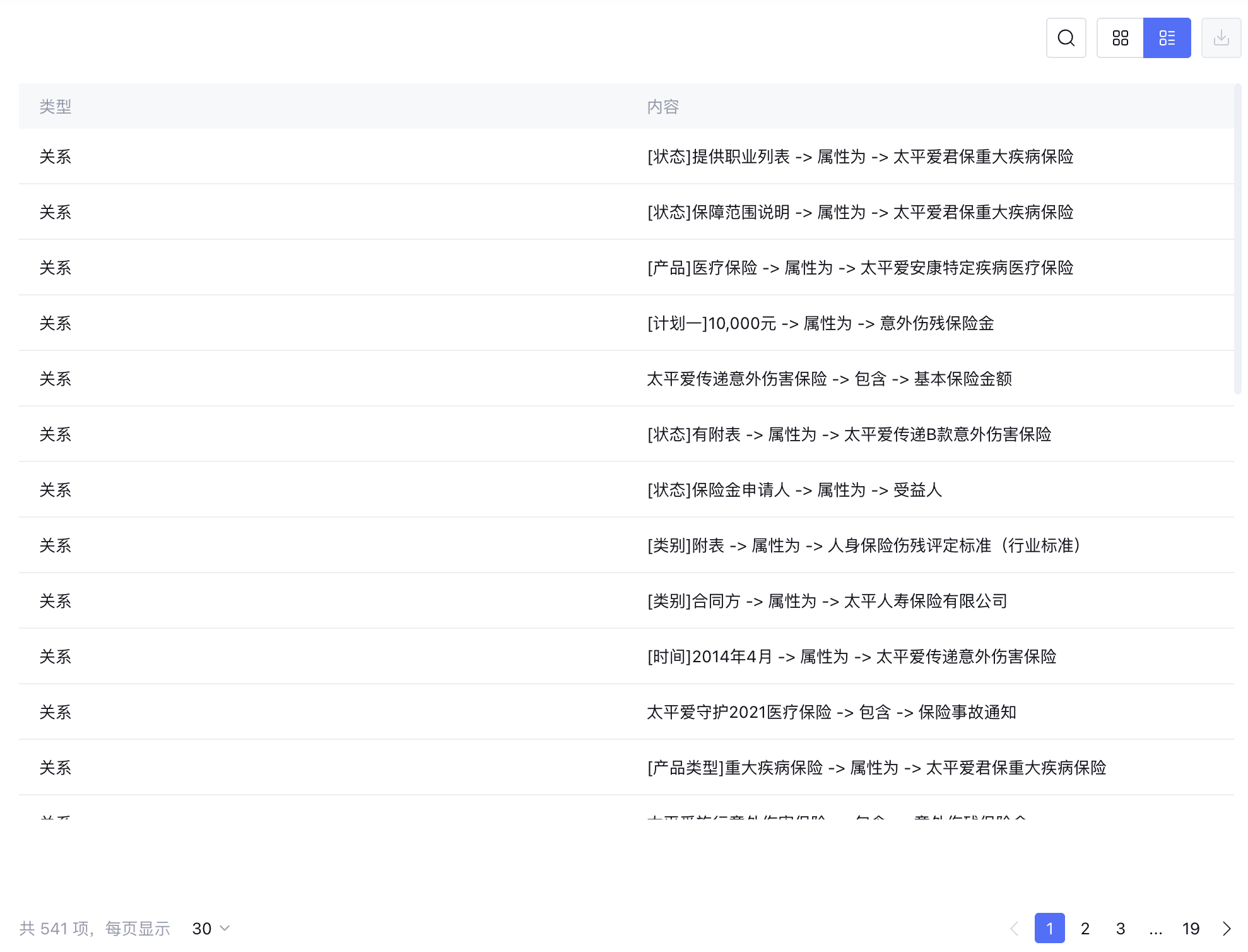 在网格视图中,通过不同颜色区分实体属性和关系,支持缩放、平移及节点搜索等操作,支持将当前视图导出为图片。 | 在列表视图中,通过表格的形式展示三元组数据,支持通过关键词搜索。 |