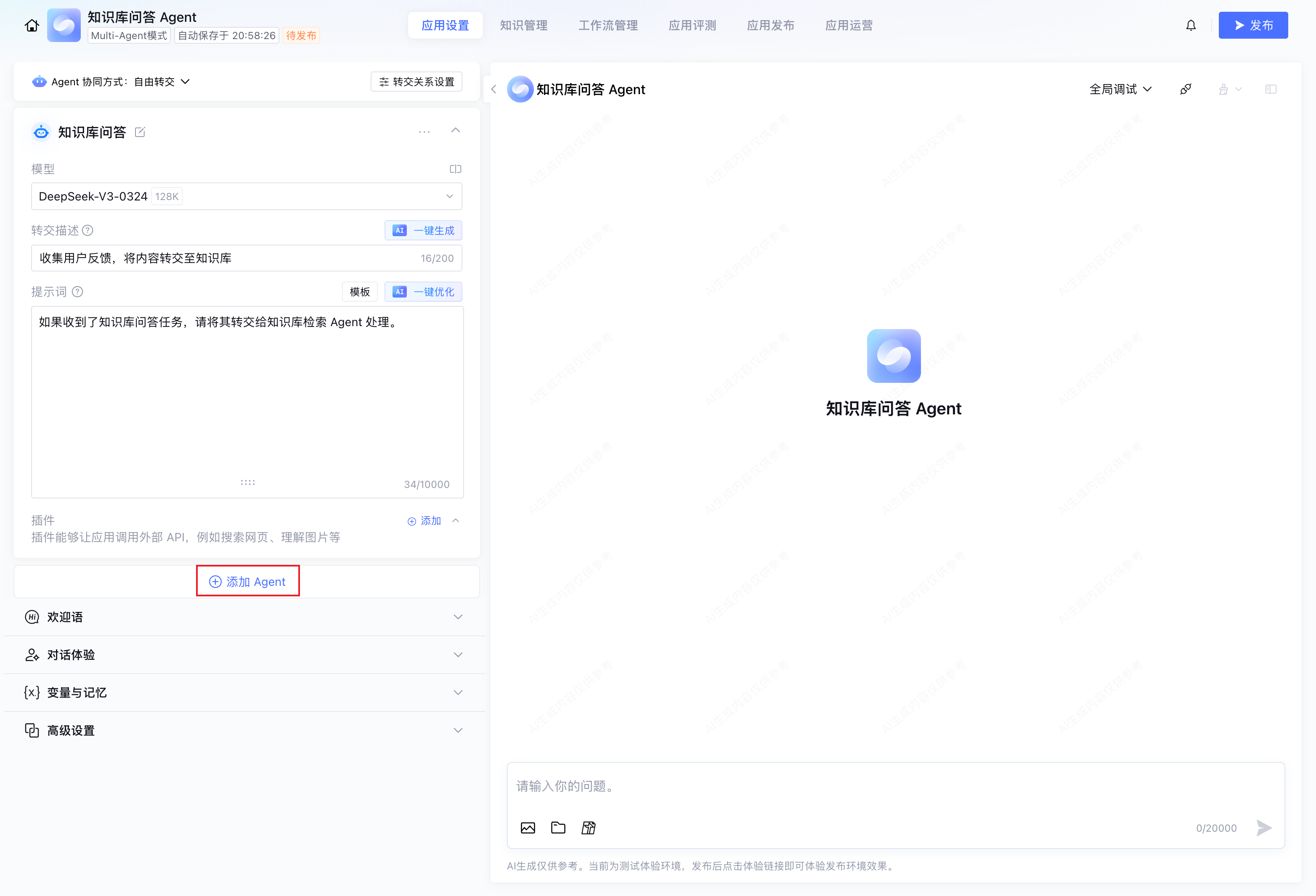 建议在主 Agent 的提示词中补充相关转交规则,以强化转交效果,例如:“咨询 xxx 类问题,请转交至知识库检索 Agent 回复。”