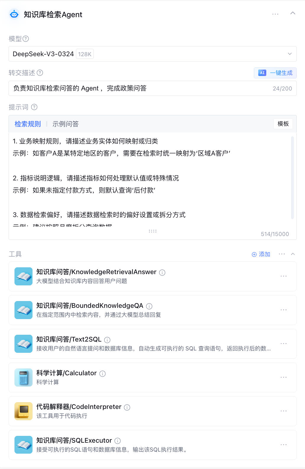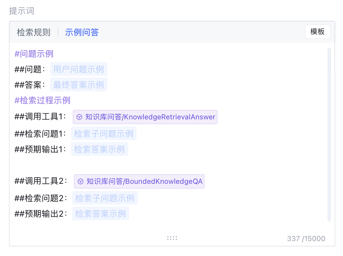 知识库检索 Agent 的提示词包含检索规则和示例问答两个部分,均需根据应用需求进行调整。两者共同定义了 Agent 如何理解用户问题、规划检索过程,并生成符合业务逻辑的回答。