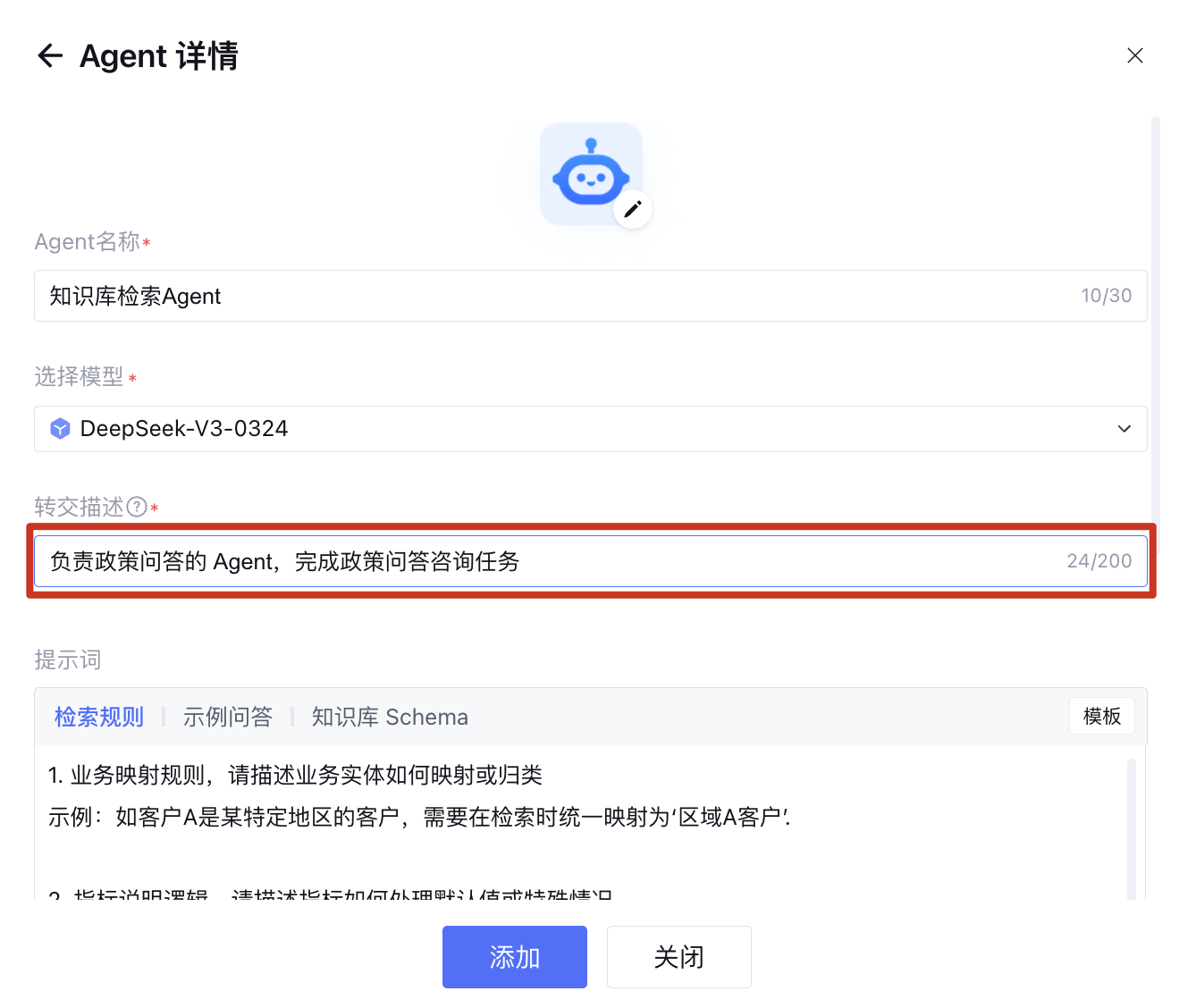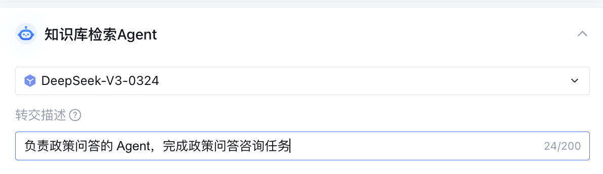 简单描述知识库检索 Agent 回答的问题范围,并补充到转交描述,例如:“负责政策问答的 Agent,完成政策问答咨询任务”。