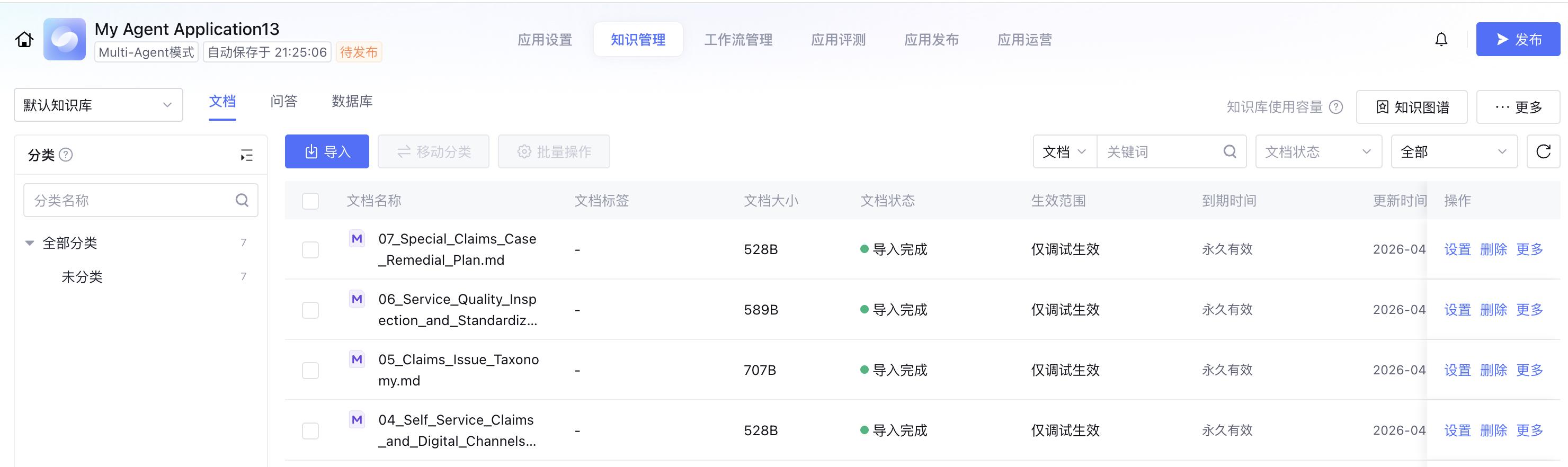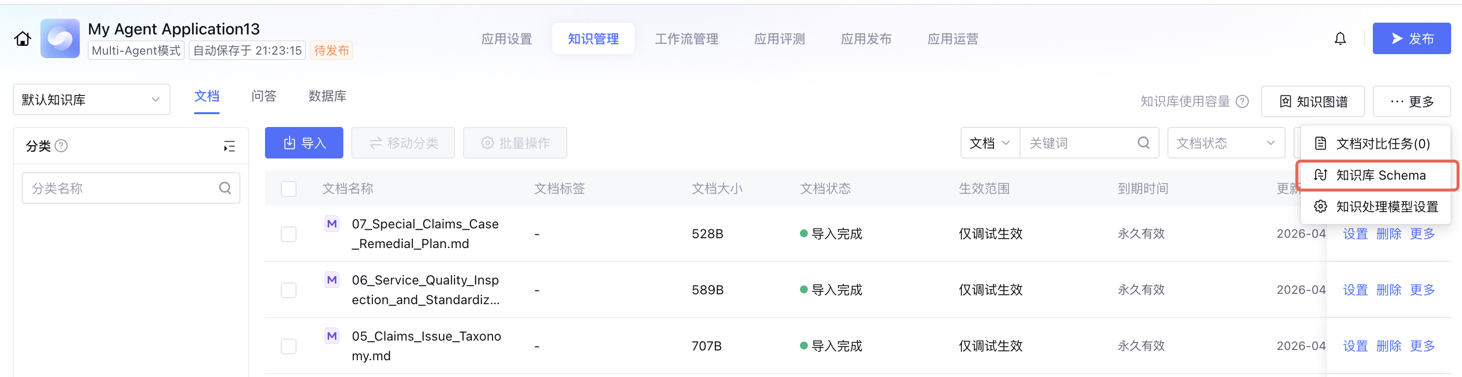 创建 Multi-Agent 模式应用,单击知识管理,导入文档。