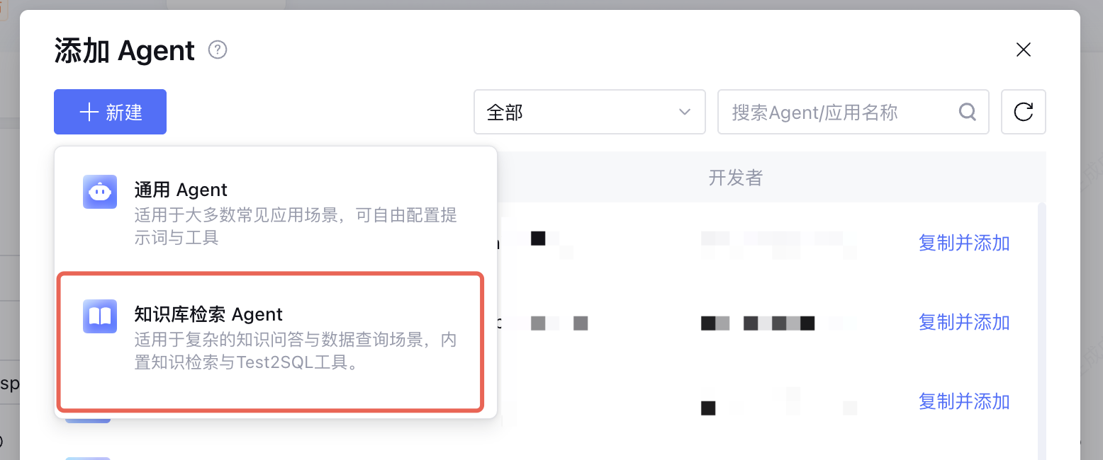 在添加 Agent 界面中,点击新建 - 选择 知识库检索 Agent。