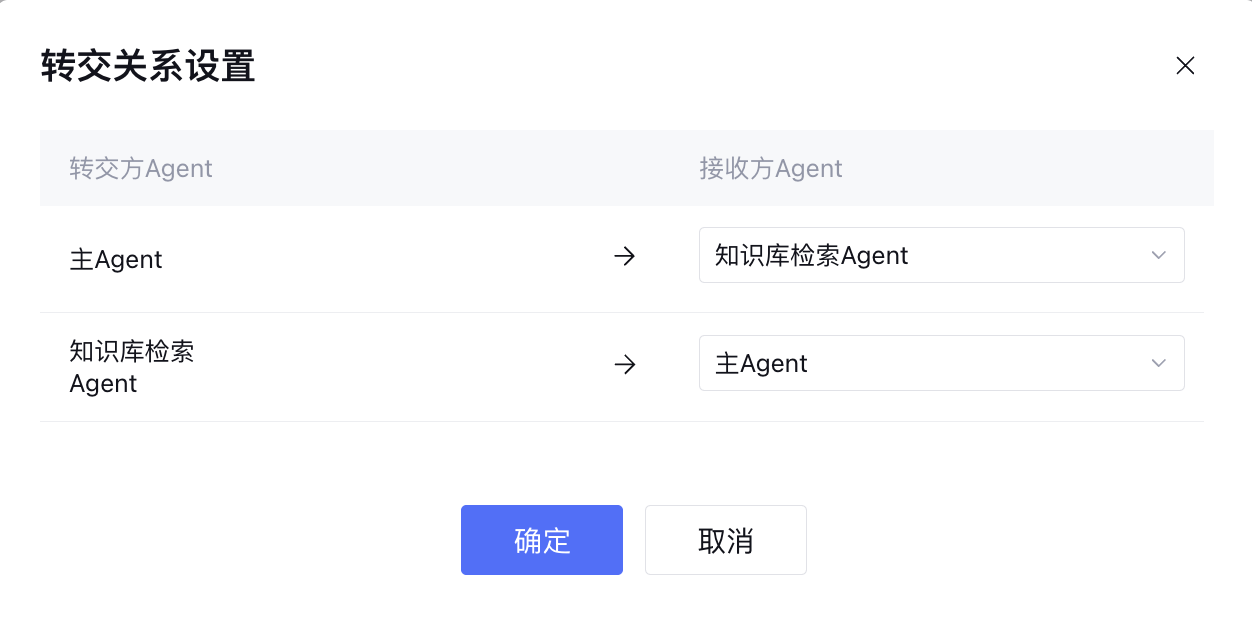 转交关系已默认配置了知识库检索 Agent 与主 Agent 之间的转交规则。