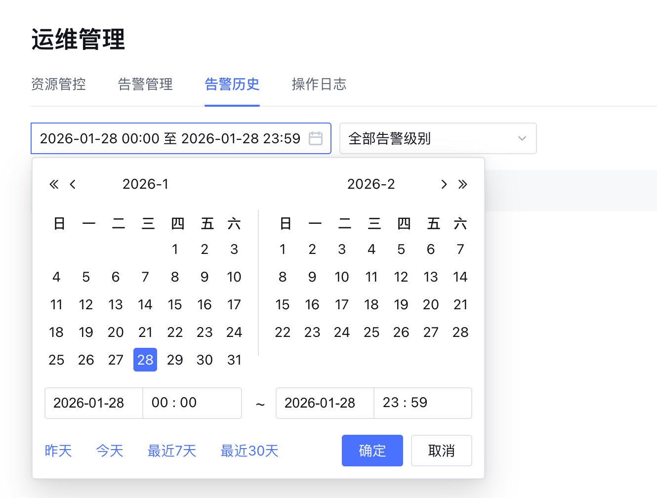 告警历史页面默认展示当日的全部告警信息。用户可手动筛选告警信息,支持按照时间或按照告警级别筛选。