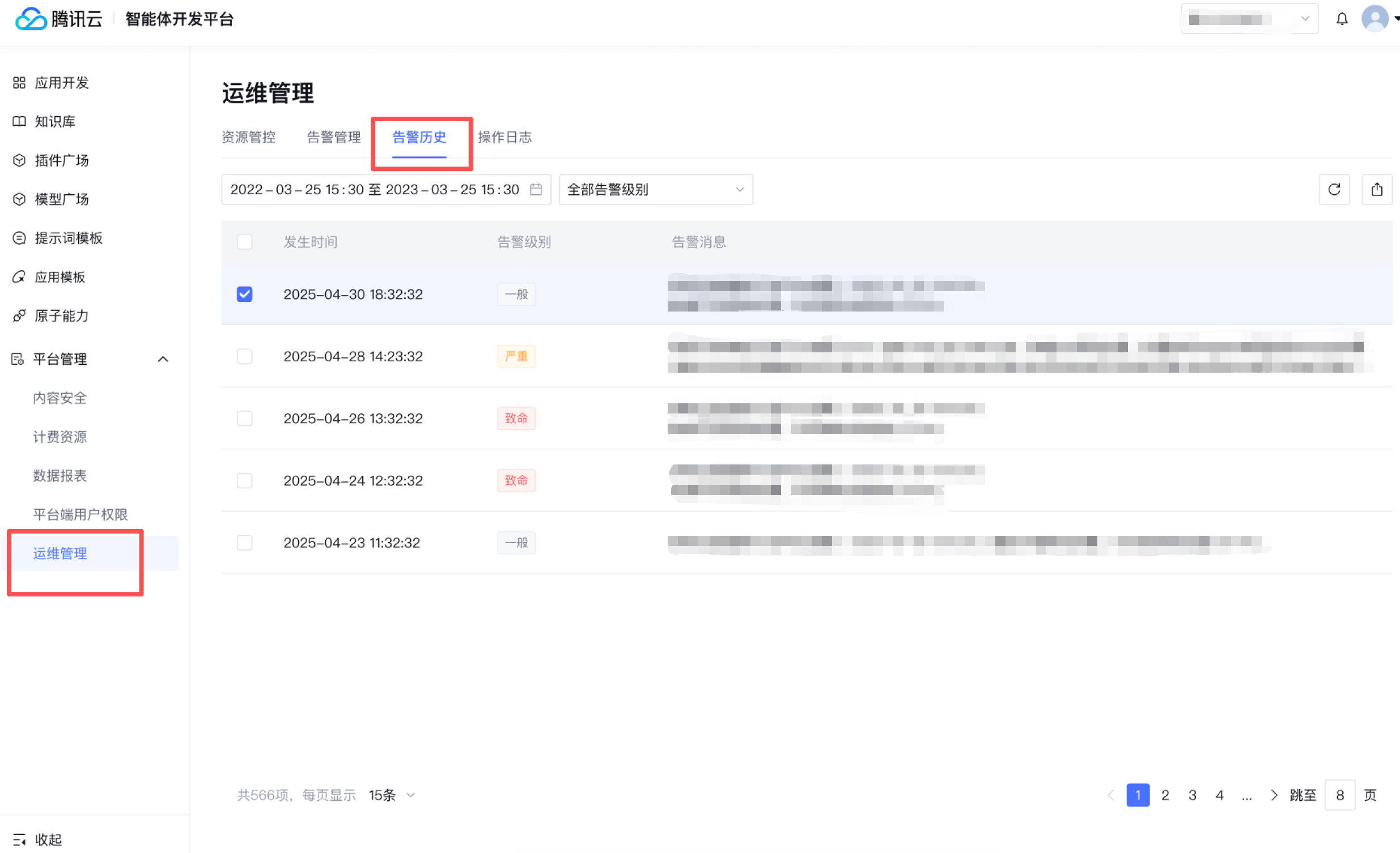 1.2 选择运维管理,即可进入企业级告警历史页面,支持查看企业级告警信息。