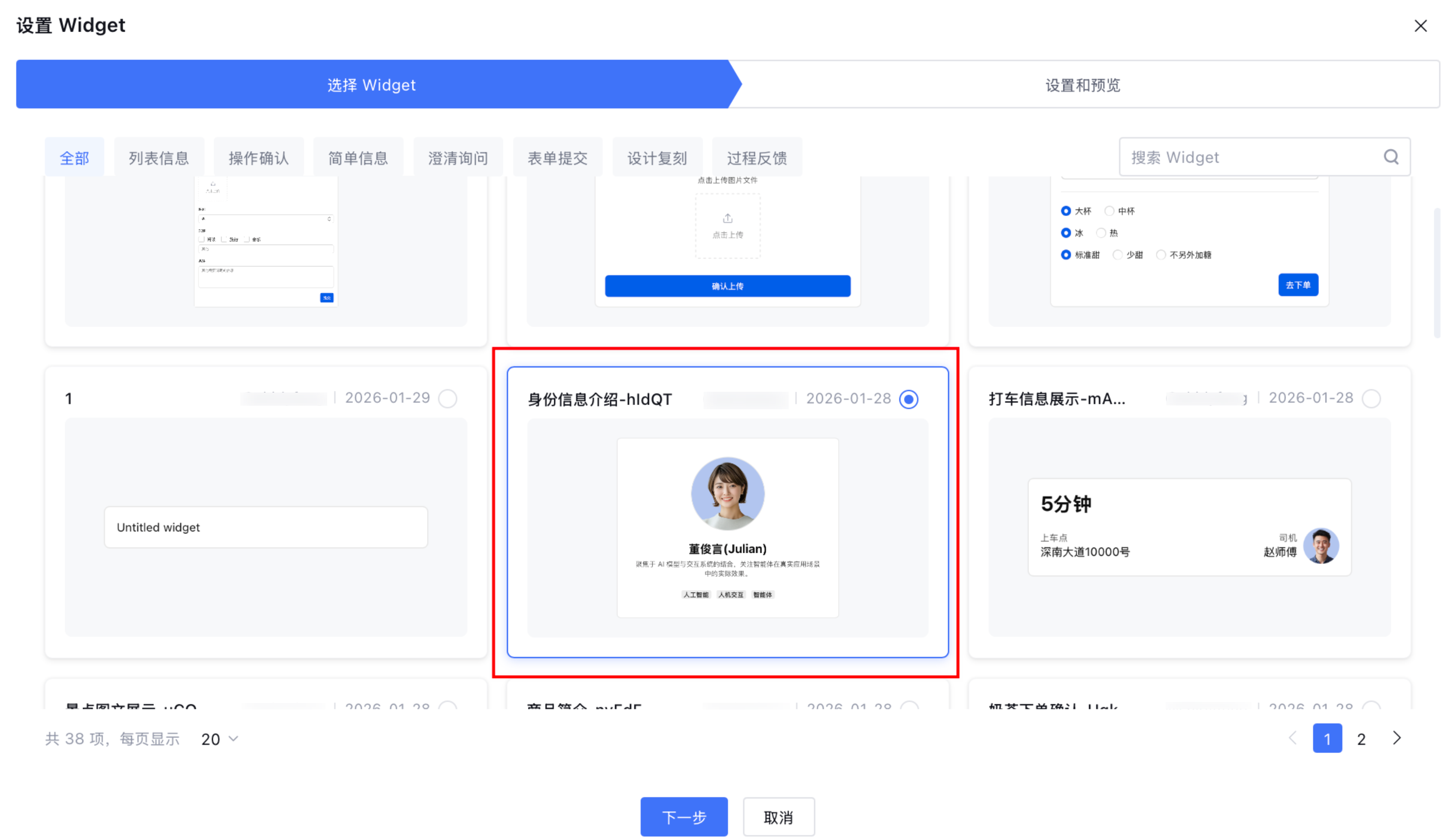 2. 用户开始对话,应用通过 Widget 进行澄清询问和信息收集。