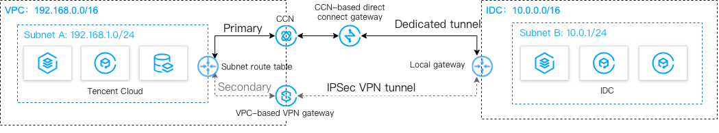 云联网(主):本地 IDC 通过物理专线,连接到云联网型专线网关,专线网关和 VPC 均接入云联网,从而实现云下云上全业务通信。在物理专线链路正常时,本地 IDC 与 VPC 之间所有的通信流量都通过云联网经物理专线进行转发。