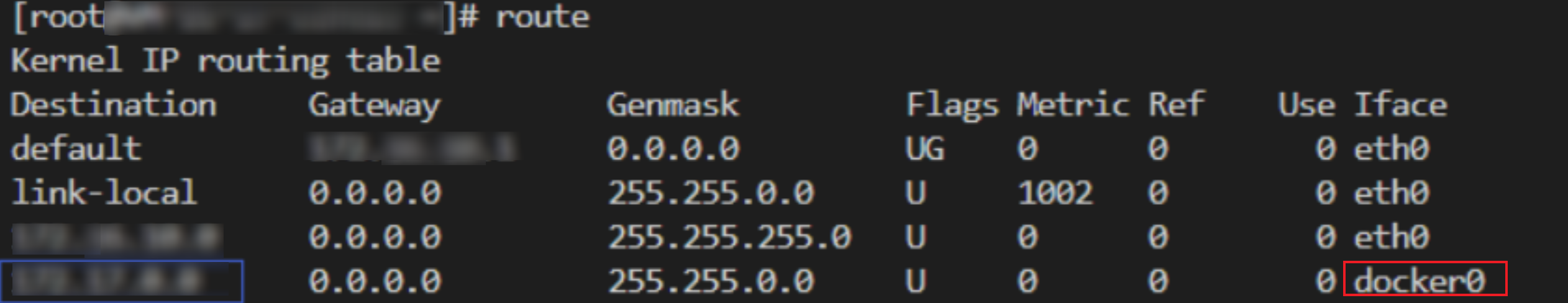2. 查看系统内是否存在 docker 容器网段路由,且与对端云服务器所在子网网段相同。