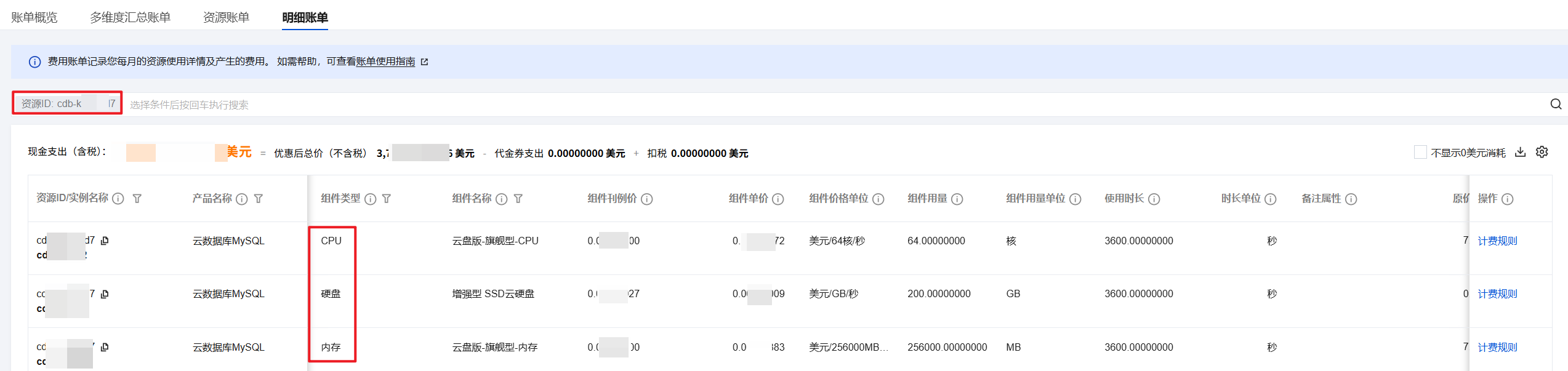 3. 在搜索框选择资源 ID,然后输入待查询的 MySQL 实例 ID,单击回车键执行搜索后,即可在下方的列表中查看到本次创建实例产生的总体费用和明细账单。