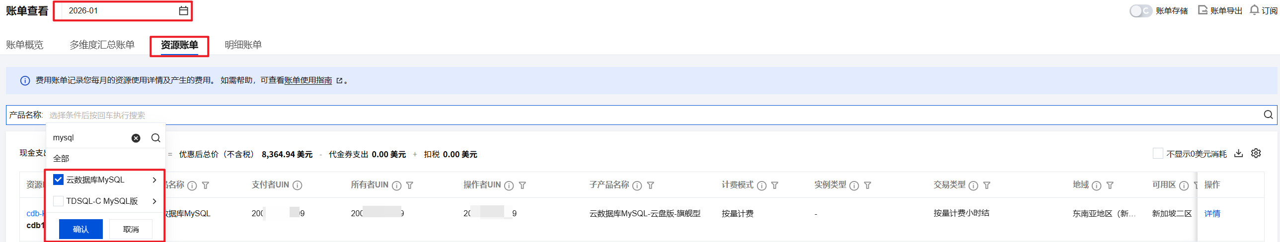 4. 在账单查看页面上方选择查询时间(月度),选择资源账单,然后在搜索框内选择产品名称,筛选找到云数据库 MySQL,单击确定,即可在列表下查询该产品在所选月度产生的费用账单。