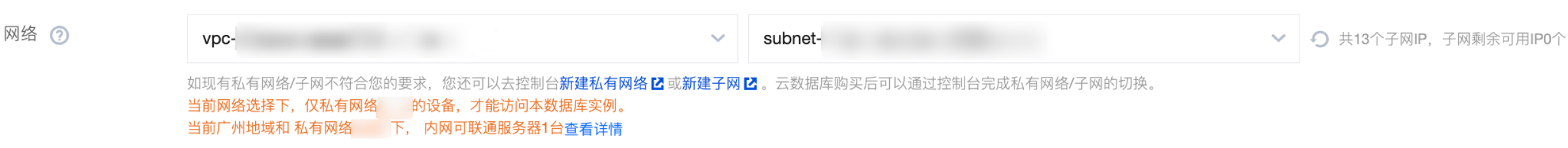 2. 在购买页的“网络类型”处,选择私有网络,选择之前创建的私有网络以及相应子网,将新购的云数据库添加进私有网络。