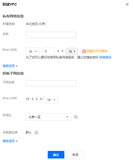 3. 填写私有网络信息和初始子网信息,单击确定即可。其中,私有网络和子网的 CIDR 创建后不可修改。