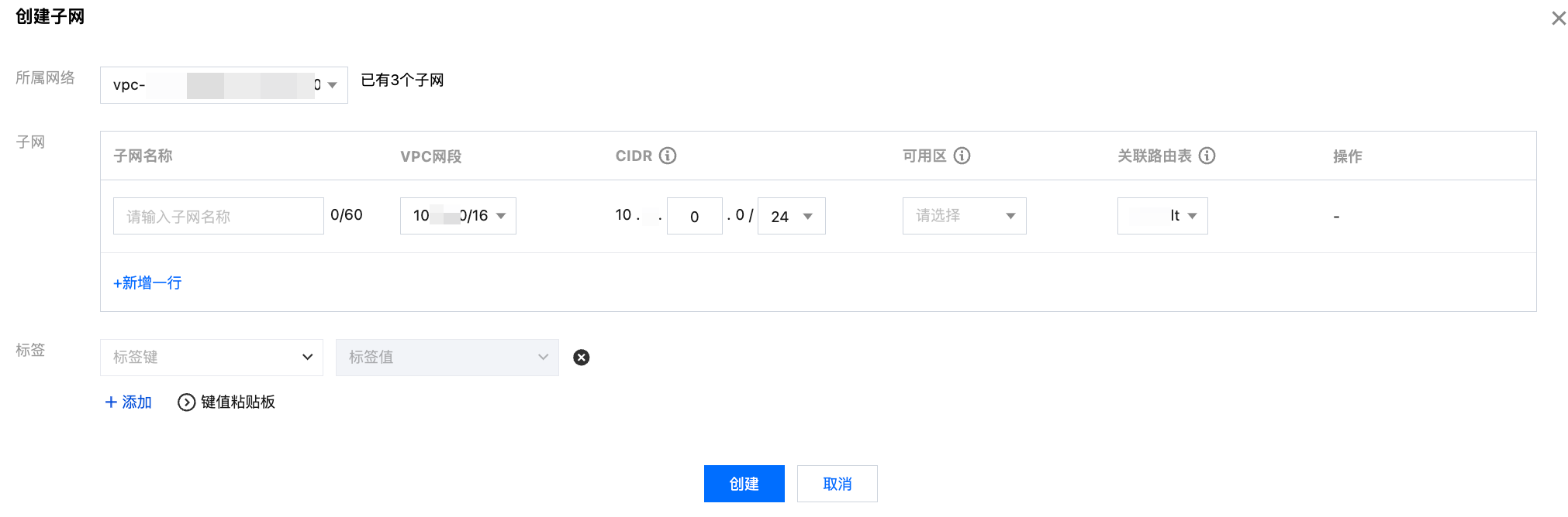 4. 填写子网名称、CIDR、可用区和关联路由表。