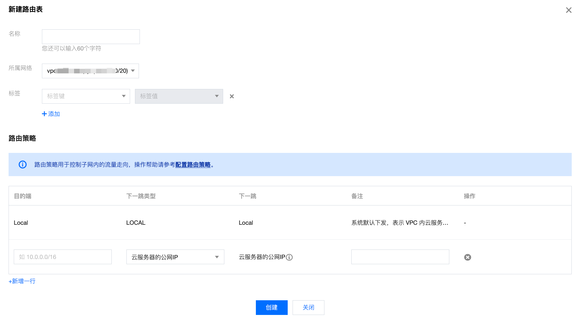 3. 在弹出的对话框中输入名称、所属网络及新建路由策略,单击创建。返回路由表列表即可看到您新建的路由表。