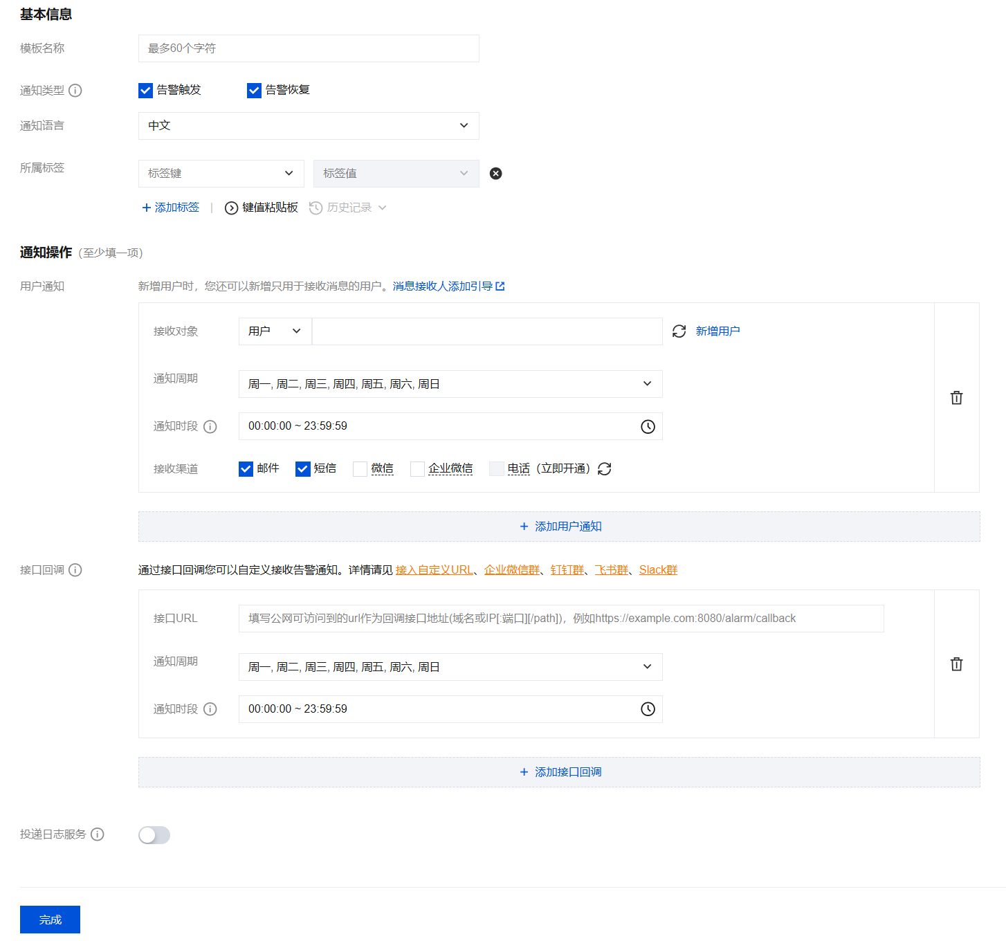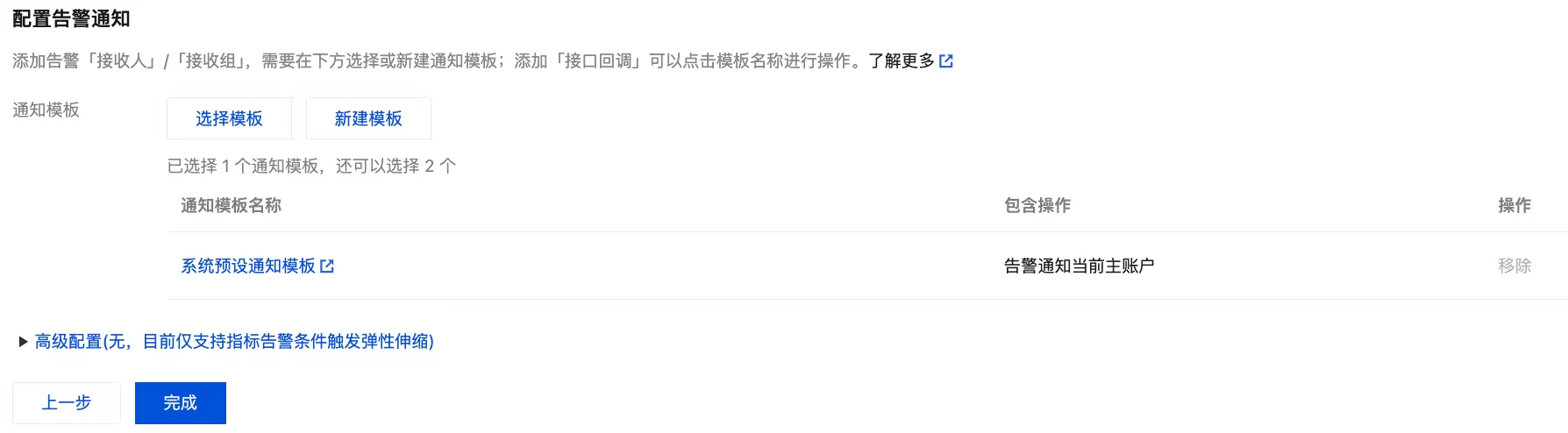 3. 配置完告警策略和告警通知后,单击完成。