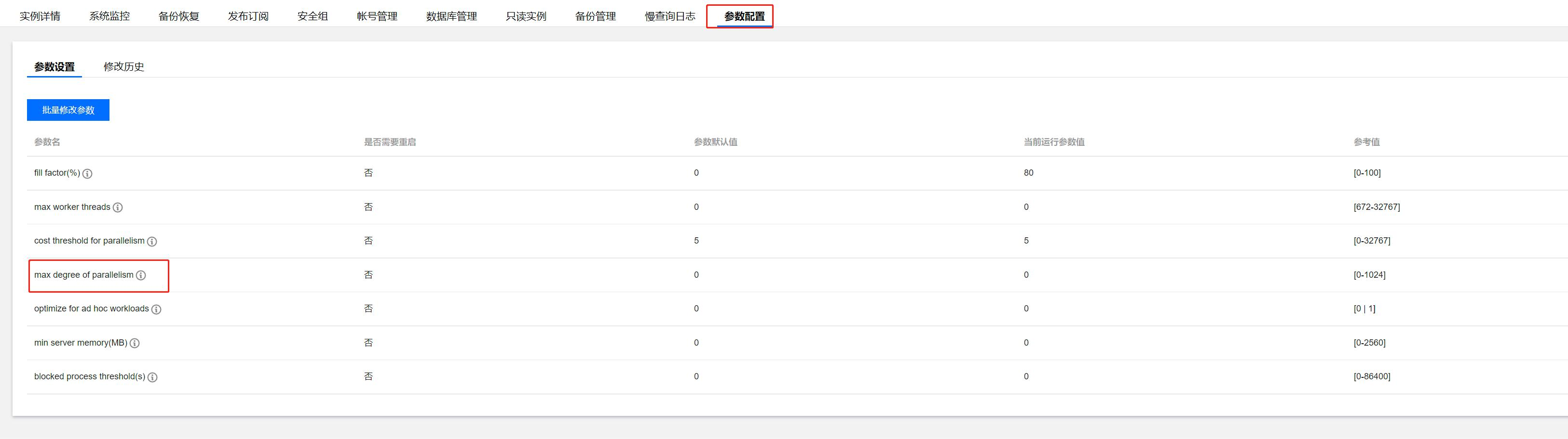 select * from sys.configurations where name like '%max%'; 修改方法:可以在控制台参数配置中进行修改。 3. 业务高并发导致实例负载升高。