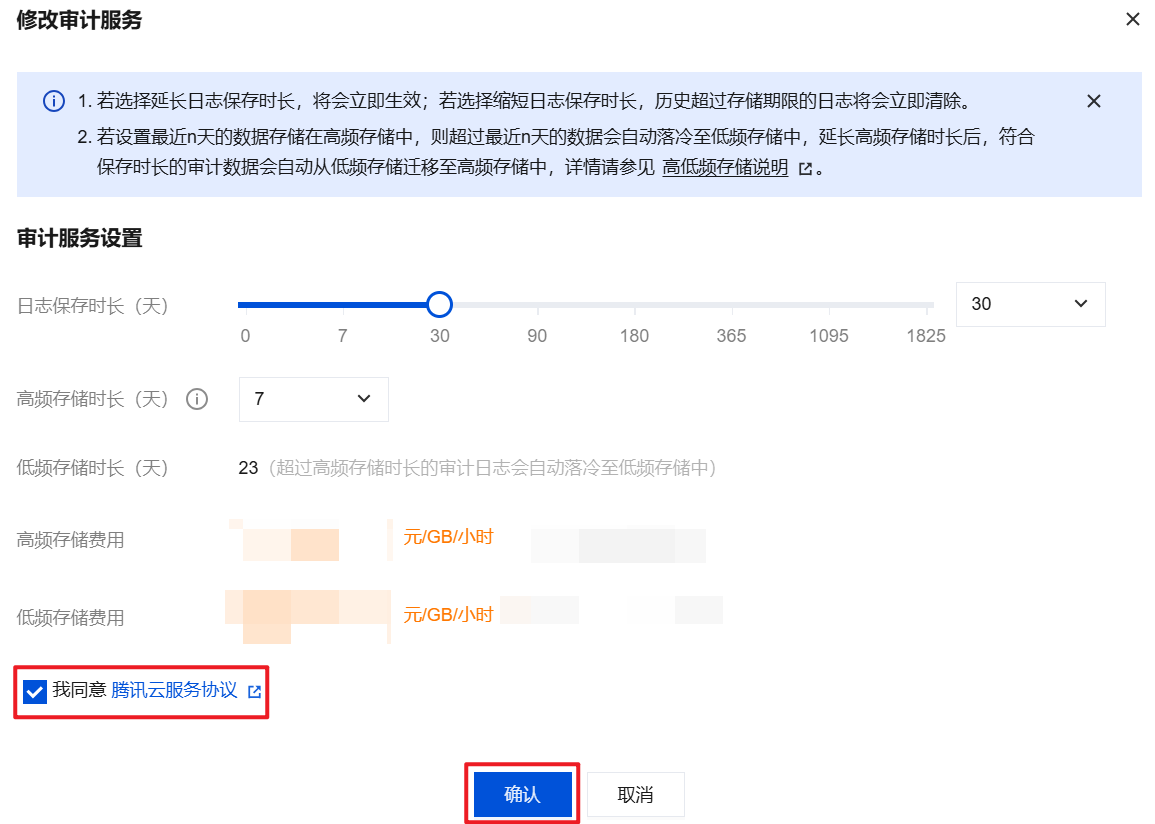 5. 在修改审计服务页面,修改日志保存时长或高频存储时长后,单击确认。