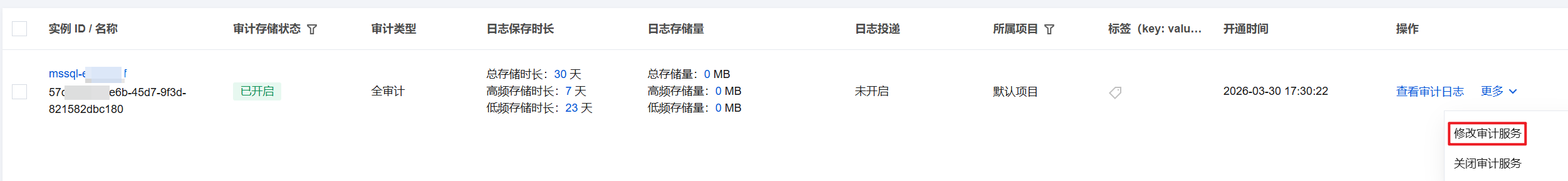 4. 在审计实例列表里找到目标实例(也可在搜索框通过资源属性筛选快速查找),在其操作列选择更多 > 修改审计服务。