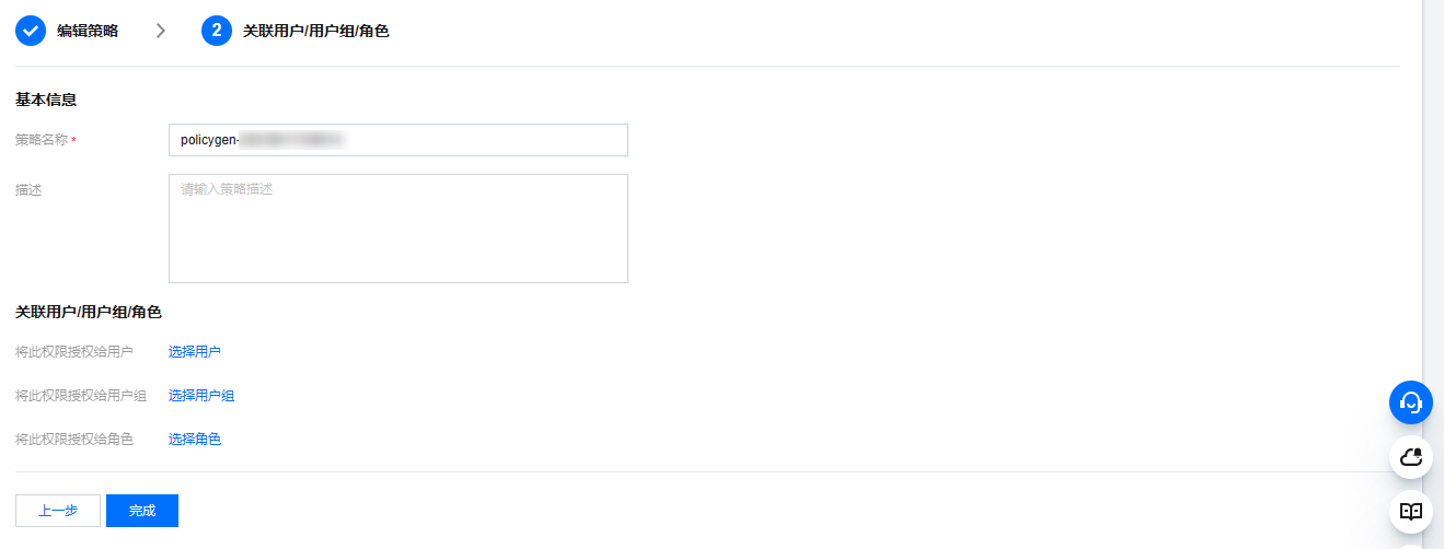 4. 在关联用户/用户组/角色页面,按命名规范,输入“策略名称”(例如 SQLAuditFullAccess)和“描述”后,单击完成。