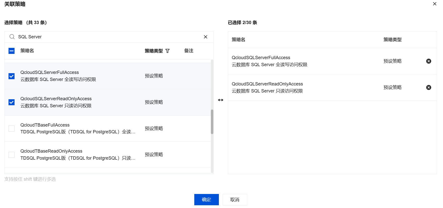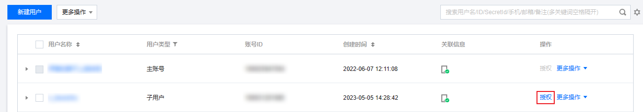 1. 以主账号身份登录 访问管理控制台,在用户列表选择对应子用户,单击授权。 2. 在弹出的对话框,选择 QcloudSQLServerFullAccess 云数据库 SQL Server 全读写访问权限或 QcloudSQLServerReadOnlyAccess 云数据库 SQL Server 只读访问权限预设策略,单击确定,即可完成子用户授权。