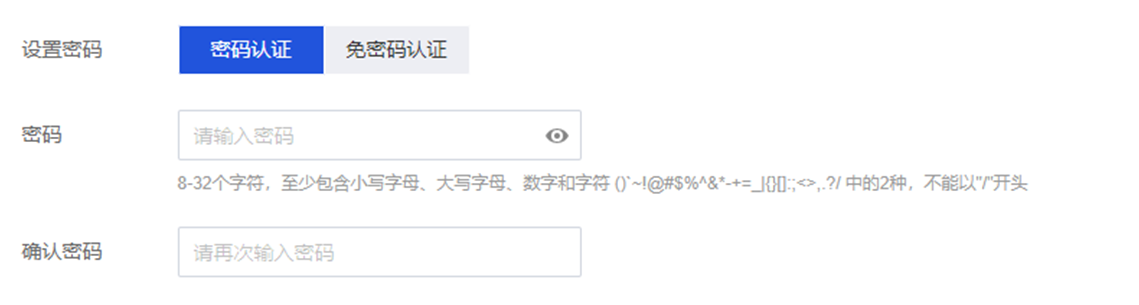 2. 在购买页的设置密码选项中,选择免密码认证,实例创建成功后无需密码认证即可访问。