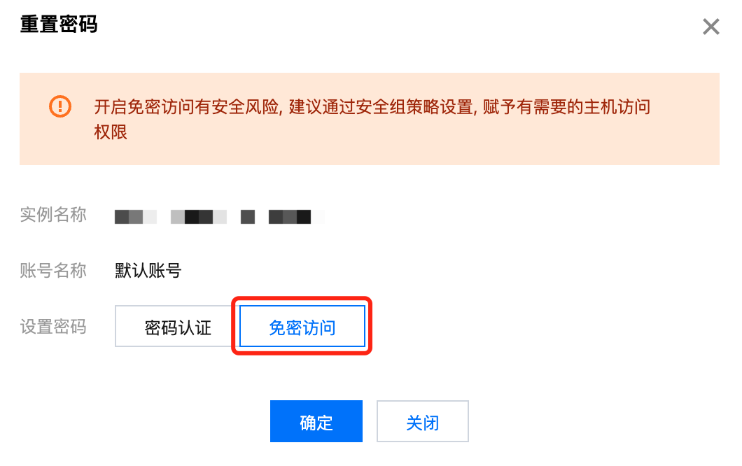 为保障数据安全,不建议开通免密码访问。