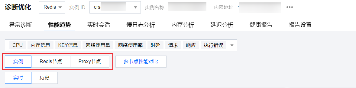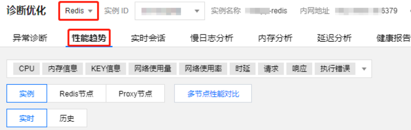 3. 在上方选择 Redis 数据库类型及实例 ID,选择性能趋势页签。