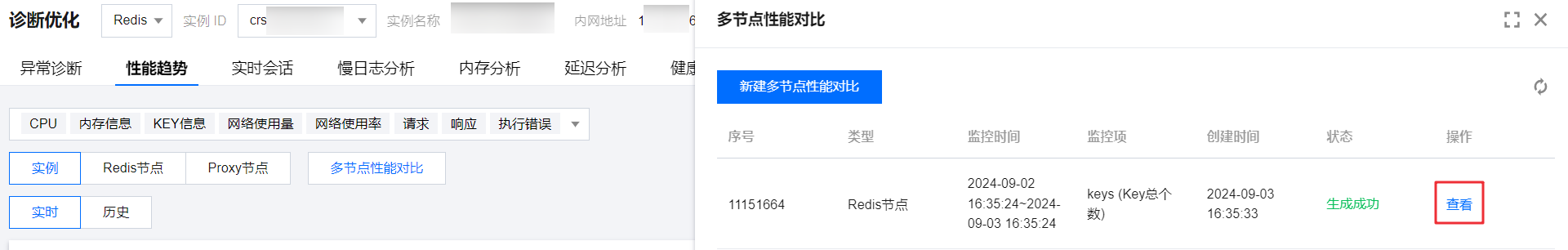 目前仅支持对监控维度为 Redis 节点的多节点性能指标对比。
