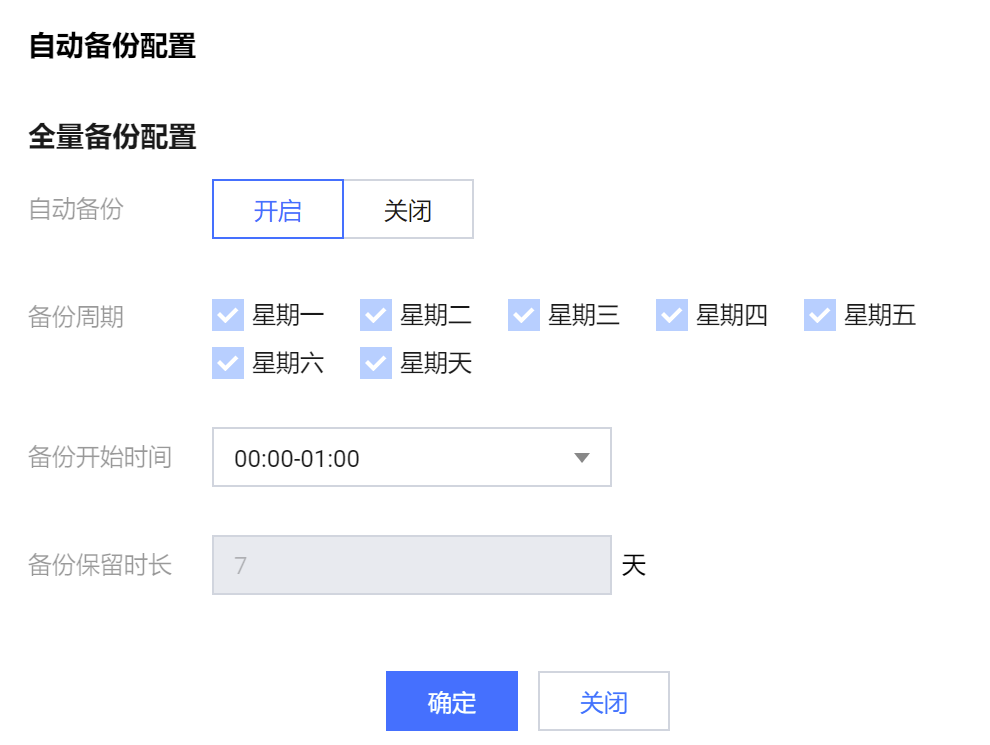 自动备份:默认开启,如需关闭,请 提交工单 申请。