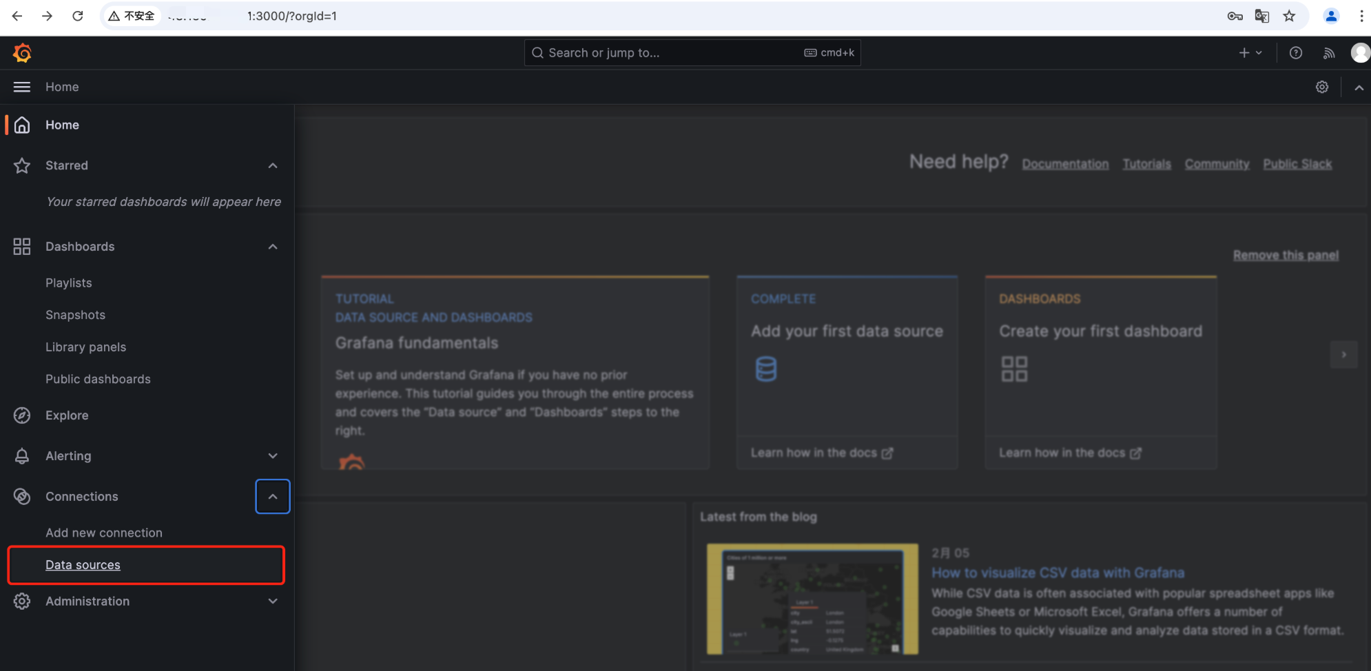 1. 在 Grafana 首页菜单,选择 Data sources。
