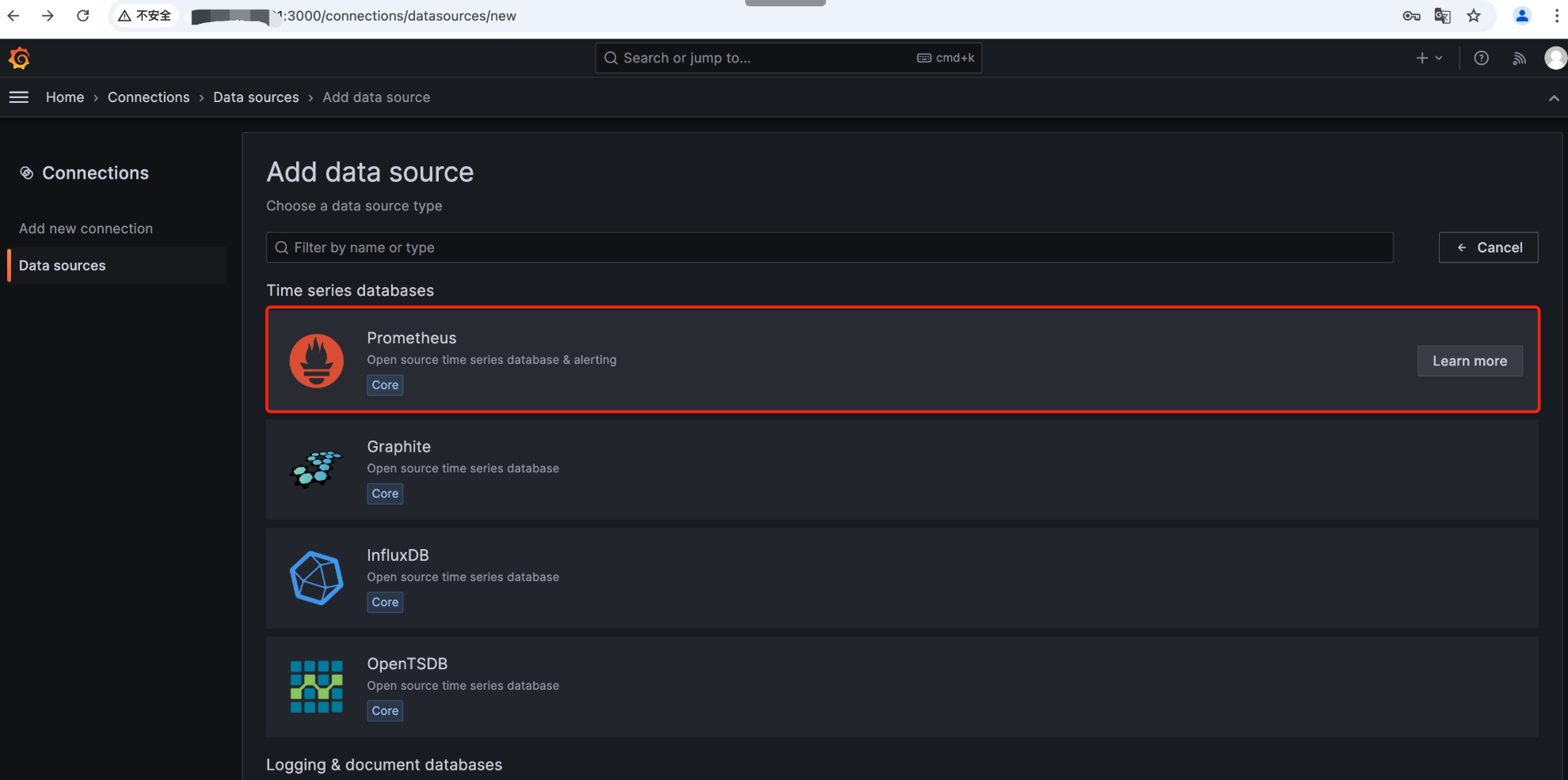 2. 进入 Data sources 界面,选择 Prometheus。