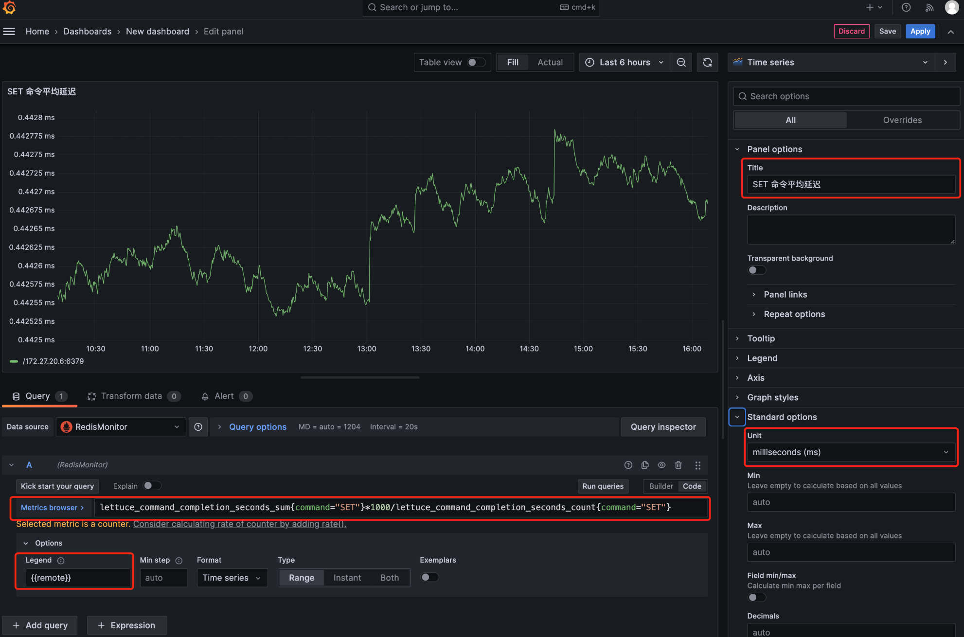 3. 在 Grafana 的监控设置界面中,Data source 选择已配置的 Prometheus 数据源 RedisMonitor。在 Query(查询语句)输入框中,写入用于监控的 Prometheus 查询语句。例如,若要显示 SET 命令的平均延迟,并将单位转换为毫秒(ms),可以使用以下查询语句。