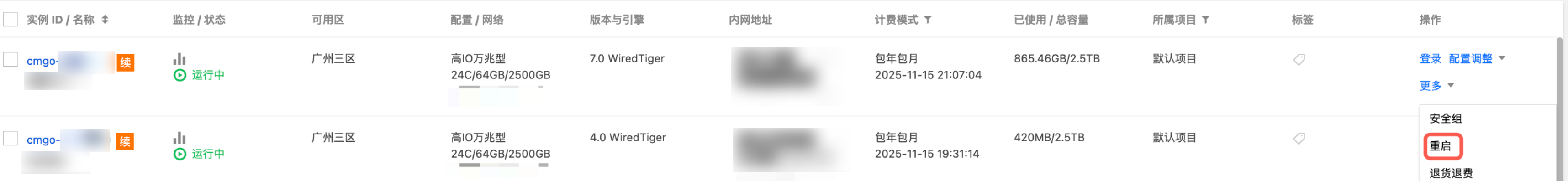 5. 在目标实例所在行,单击其操作列的更多 > 重启。