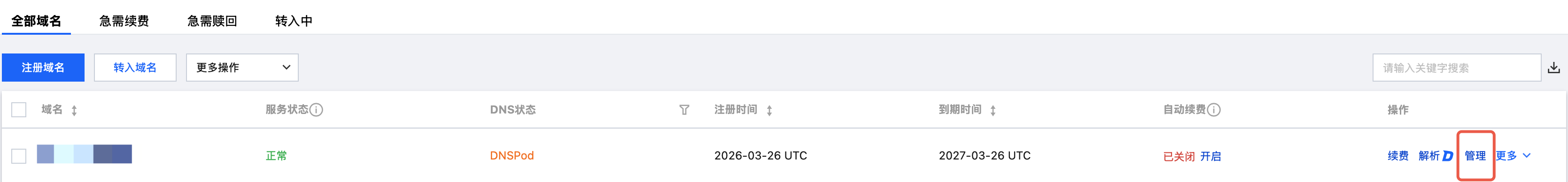 2. 选择待修改 DNS 的域名,单击管理。如下图所示: